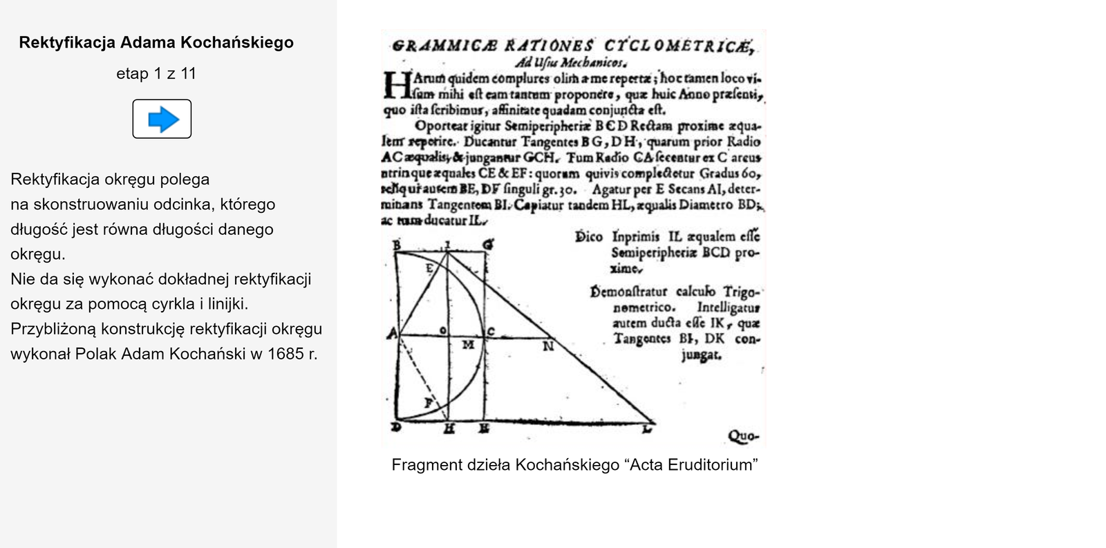 Jedną z przybliżonych konstrukcji wyprostowania okręgu podał w r. Adam Kochański, nadworny matematyk króla Jana Sobieskiego.
