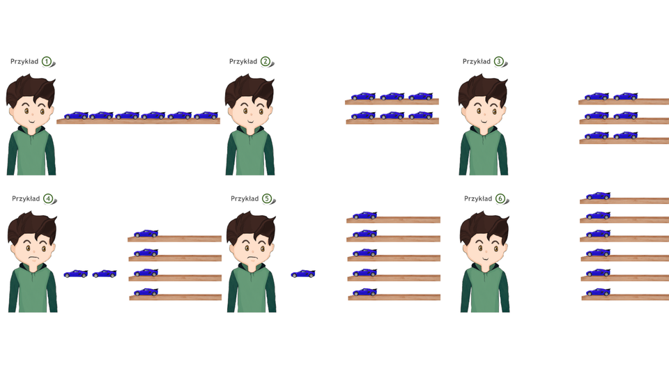 Animacja przedstawia dzielniki liczby na przykładzie ustawiania samochodzików na półkach.