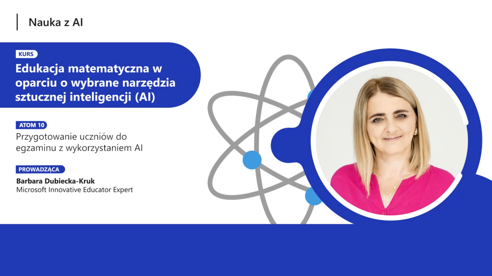 Jak przygotować uczniów do egzaminu ósmoklasisty lub matury z matematyki z pomocą sztucznej inteligencji? W tym module zobaczysz, jak połączyć funkcje narzędzi Microsoft – od Akceleratora „Postępy w matematyce”, przez OneNote, po Microsoft Copilot i Forms – by stworzyć spójny system powtórek i diagnozy postępów. Dowiesz się, jak planować działania, analizować wyniki i wspierać uczniów w samodzielnym utrwalaniu materiału.