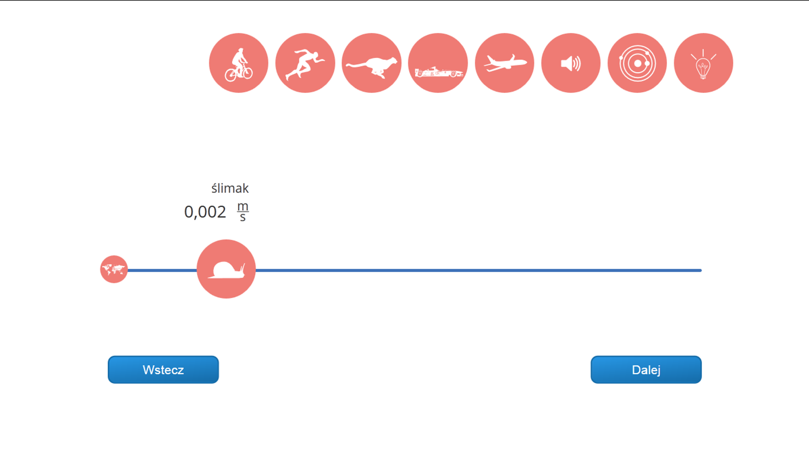Przebyta droga, czas i prędkość to wielkości ściśle ze sobą związane. Aby się o tym przekonać, zagraj w grę. Spróbuj przetrwać na torze wyścigowym i jednocześnie obserwuj, jak zmieniają się droga i prędkość twojego ruchu.