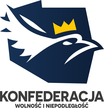 Konfederację przedstawia granatowy prostokąt z napisem „KONFEDERACJA” oraz stylizowaną głową orła ujętą geometrycznie - pod napisem mniejszy dopisek „Wolność i Niepodległość”. Symbolika: granat i biel nadają znakowi ton państwowy i „oficjalny”, geometryczny przeł w koronie odwołuje się do tradycji narodowej i suwerenności. Hasło: „Wolność i Niepodległość” wzmacnia przekaz suwerenistyczny i liberalno‑wolnościowy. Minimalistyczna kreska i brak ozdobników sygnalizują dyscyplinę przekazu oraz kontrast wobec „partyjnej wielobarwności”.