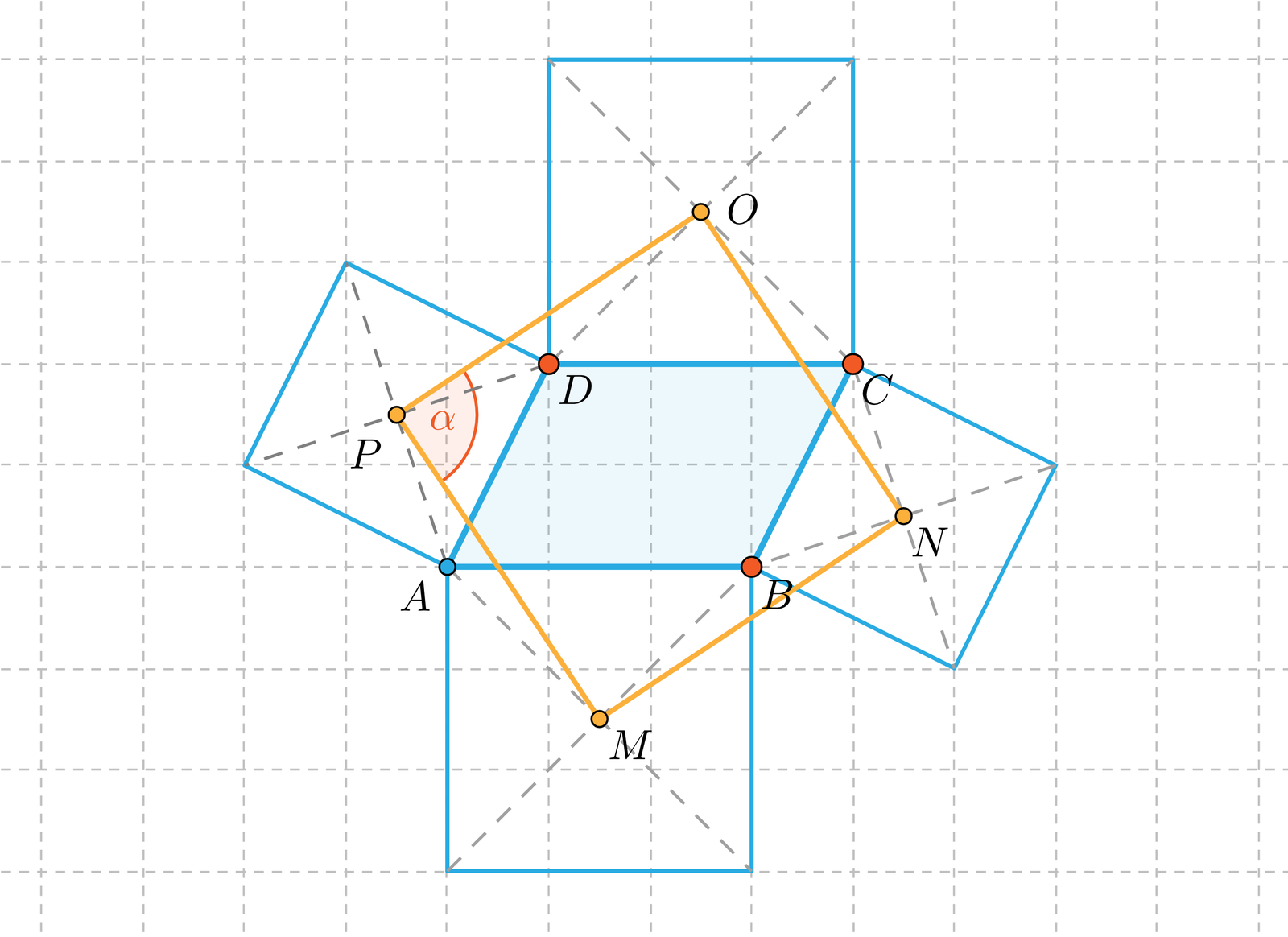 Wtedy każdy z boków kwadratów i jest równy , kąt ma miarę , a każdy z kątów i ma miarę . Trójkąty i są przystające, co stwierdzamy, powołując się na cechę bok – kąt – bok, ponieważ