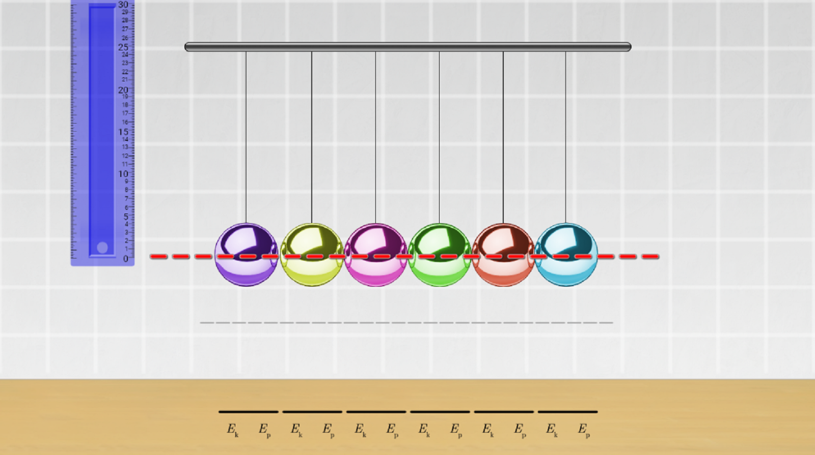 Za pomocą poniższej symulacji możesz zbadać energie wahadeł w zależności od ich wychylenia. Wybrane wahadła możesz wychylać na różne wysokości. Zwróć uwagę na punkty szczególne, w których albo energia kinetyczna, albo energia potencjalna jest maksymalna.