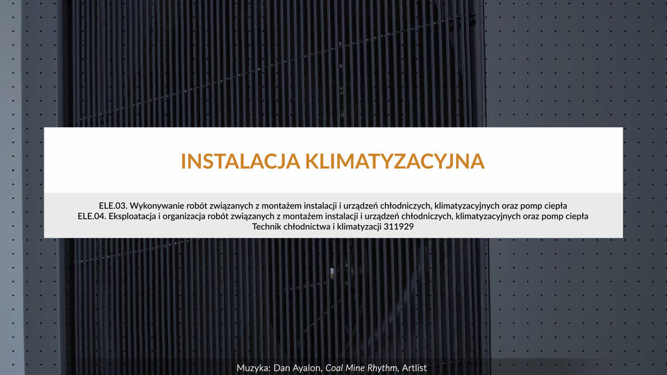 Film nawiązujący do treści materiału Instalacja klimatyzacyjna ELE.03 Wykonywanie robót związanych z montażem instalacji i urządzeń chłodniczych, klimatyzacyjnych oraz pomp ciepła. ELE.04 Eksploatacja i organizacja robót związanych z montażem instalacji i urządzeń chłodniczych, klimatyzacyjnych oraz pomp ciepła zawód technik chłodnictwa i klimatyzacji kod zawodu trzy jeden jeden dziewięć dwa dziewięć.