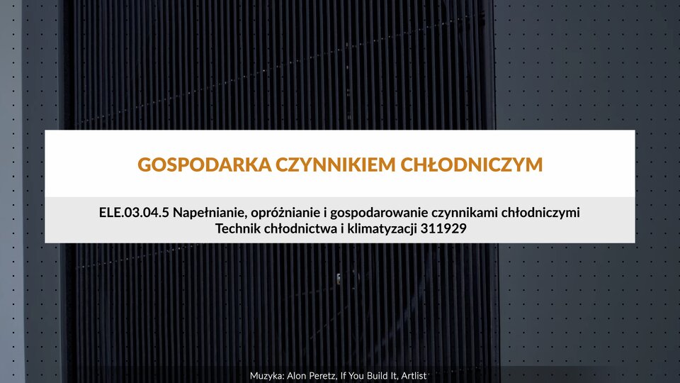Materiał filmowy zatytułowany "Gospodarka czynnikiem chłodniczym" dla zawodu Technik chłodnictwa i klimatyzacji; kwalifikacja zawodowa: E eL eM kropka 03 kropka 04 kropka 5 Napełnianie, opróżnianie i gospodarowanie czynnikami chłodniczymi