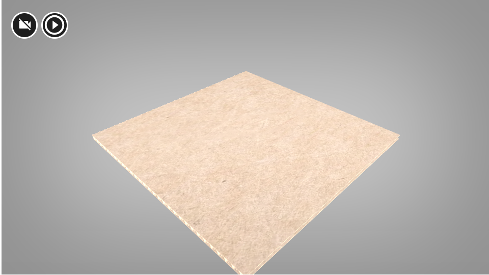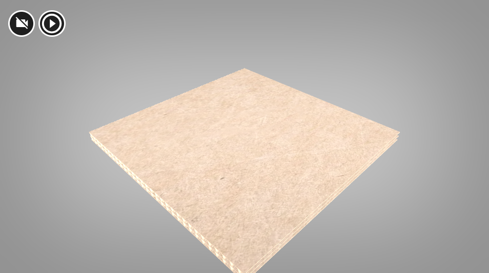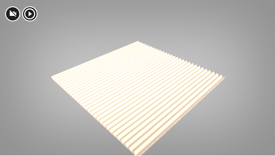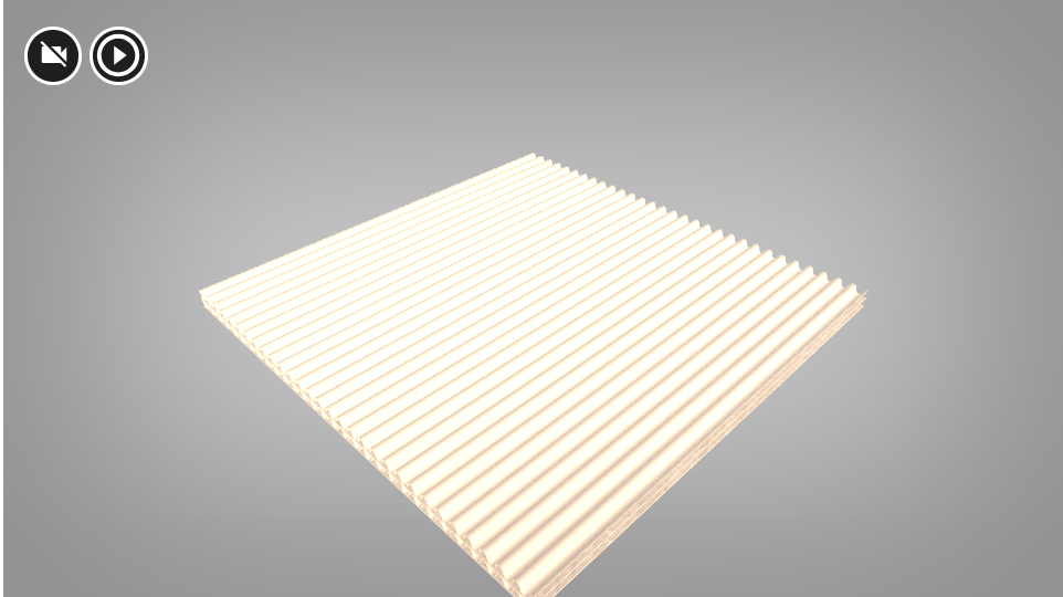 Wizualizacja 3D prezentuje obracający się model tektury trzywarstwowej. Widoczny jest prostokątny arkusz tektury, płaski od spodu i u góry z warstwą z falą pomiędzy.