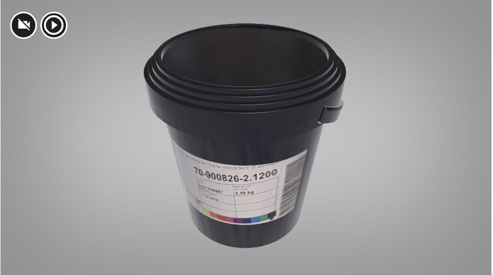 Wizualizacja 3D prezentuje obracający się model pojemnika z farbą. Widoczny jest walcowaty, czarny pojemnik na farbę z okrągłą czarną pokrywką, której średnica jest większa niż średnica pojemnika. Na boku pojemnika widoczna jest biała etykieta z numerycznym kodem, tabelą oraz kolorowym paskiem u dołu.