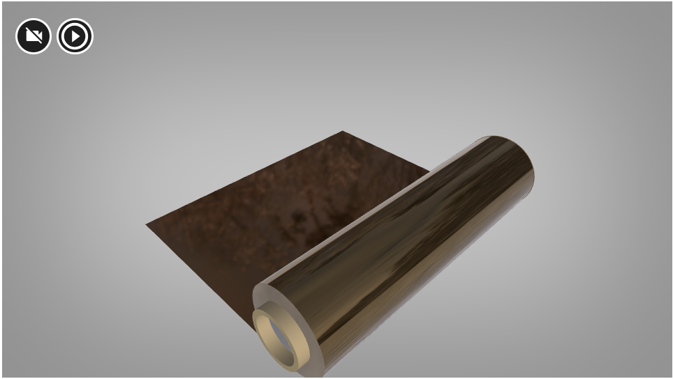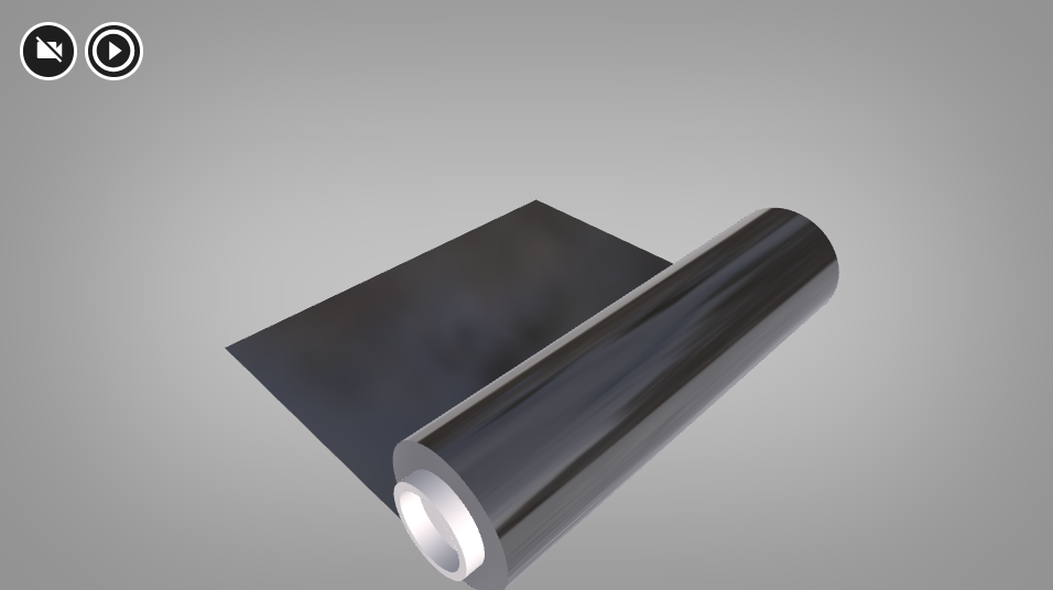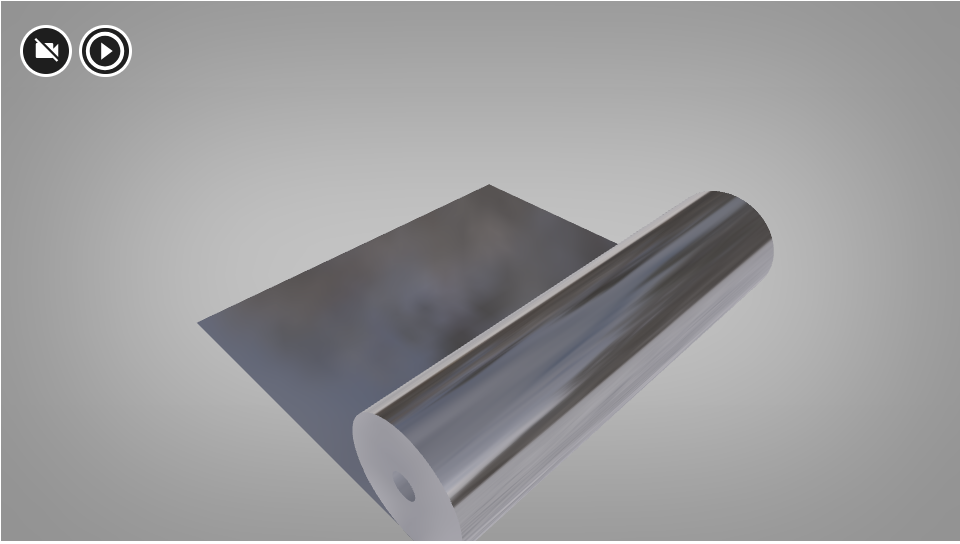 Wizualizacja 3D prezentuje obracający się model folii aluminiowej. Widoczna jest lekko rozwinięta rola folii w kolorze ciemnografitowym, błyszcząca na zewnętrznej powierzchni i matowa na wewnętrznej, nawinięta na białą szpulę.