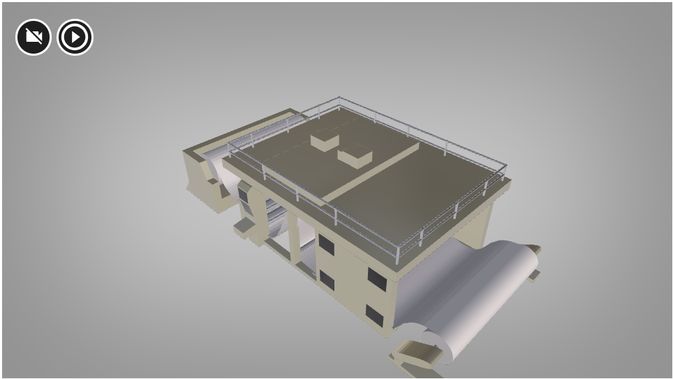 Wizualizacja 3D prezentuje obracający się model 3D maszyny szerowstęgowej. Widoczny jest: od lewej strony, rola podłoża drukowego w kolorze białym, umieszczona w odwijaku w formie prostopadłościennej. Następnie widoczny jest korpus maszyny z zespołem drukującym, naciągiem wstęgi podłoża. Na końcu widoczny jest nawijak do nawijania zadrukowanej roli podłoża drukowego.