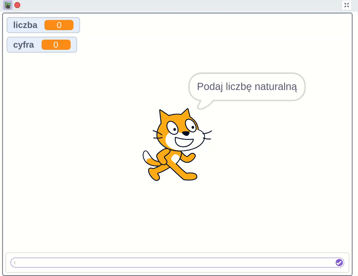 Przykładowy program w języku ScratchScratch, który rozwiązuje problem wyodrębniania cyfr liczby podanej przez użytkownika