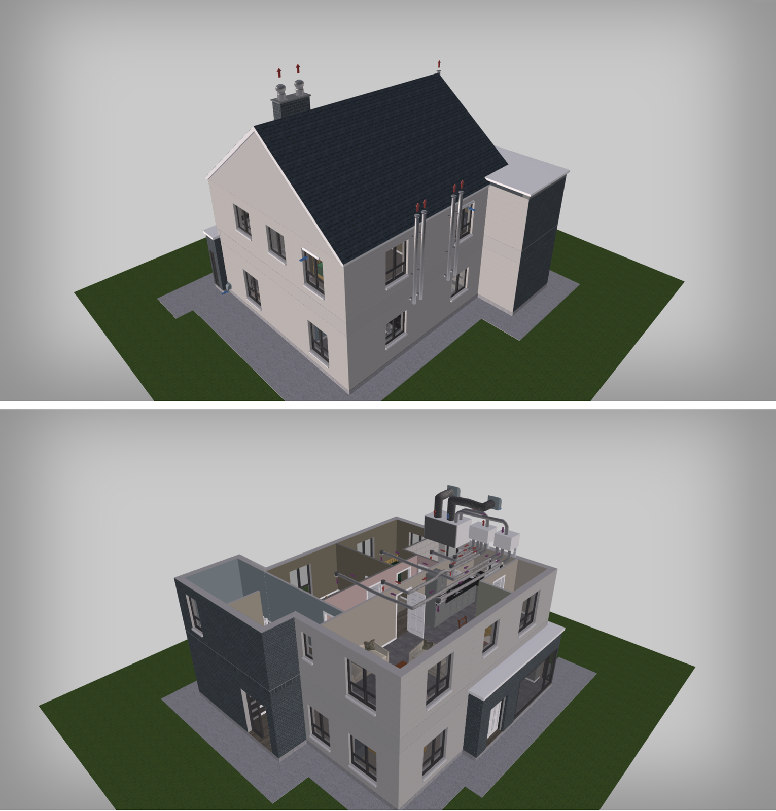 Wizualizacja 3D. Model pierwszy. Wentylacja grawitacyjna wspomagana.