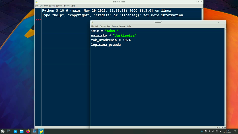 int Możliwe odpowiedzi: 1. 0.15, 2. -20, 3. nieprawda, 4. True, 5. 11, 6. 13, 7. siedem, 8. False, 9. -1.94 float Możliwe odpowiedzi: 1. 0.15, 2. -20, 3. nieprawda, 4. True, 5. 11, 6. 13, 7. siedem, 8. False, 9. -1.94 bool Możliwe odpowiedzi: 1. 0.15, 2. -20, 3. nieprawda, 4. True, 5. 11, 6. 13, 7. siedem, 8. False, 9. -1.94 str Możliwe odpowiedzi: 1. 0.15, 2. -20, 3. nieprawda, 4. True, 5. 11, 6. 13, 7. siedem, 8. False, 9. -1.94"imie" wartość "Adam". Możliwe odpowiedzi: 1. imie = "Adam", 2. imie = Adam, 3. imie == "Adam", 4. "imie" = "Adam"Uruchom w swoim komputerze IDLE. Sprawdź, którą wersję Pythona masz zainstalowaną. Umieść informację na temat swojej wersji w polu pod przykładem.