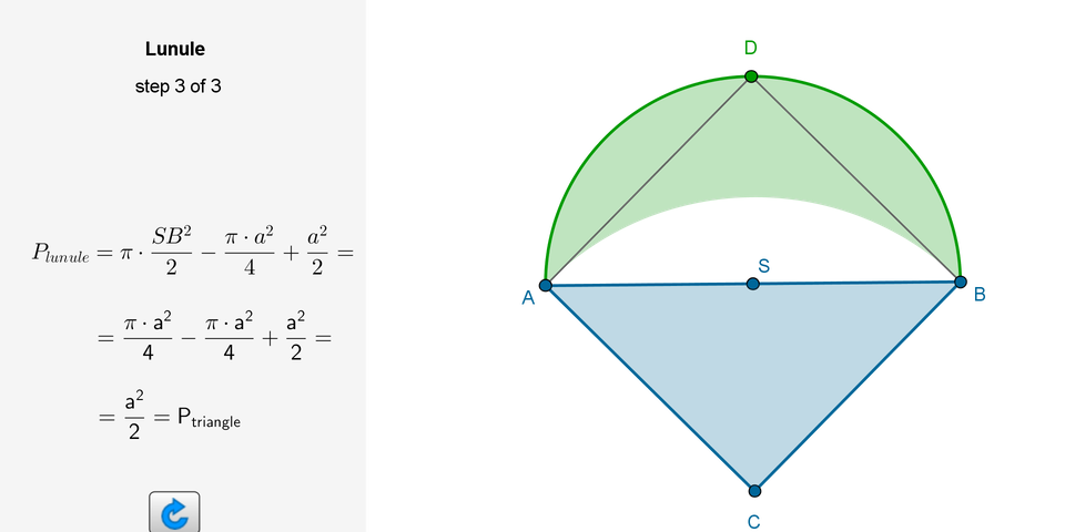 Based on the previous description, make the construction of the triangular lunula on their own and calculate its area. Then compare the area of the moon with the area of a right‑angled, isosceles triangle.