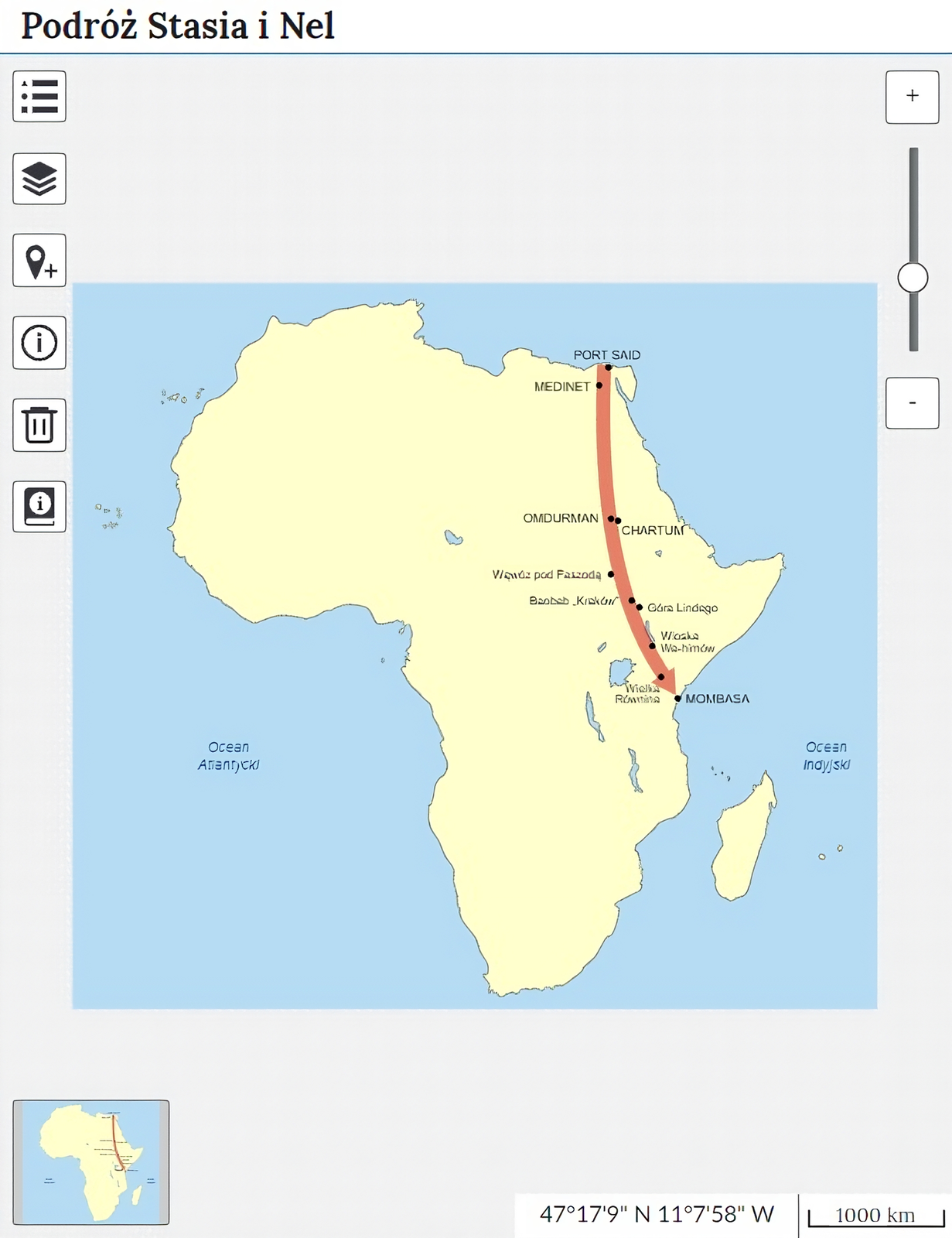 Mapa interaktywna pt. Podróż Stasia i Nel Mapa przedstawia kontynent Afryki. Mapa składa się z warstwy bazowej i 2 warstw dodatkowych. Opis warstwy bazowej: Na mapie zaznaczone zostały najważniejsze punkty podróży Stasia i Nel: Port Said, Medinet, Chartum, Omdurman, Faszoda, Wąwóz pod Faszodą, Baobab „Kraków”, Góra Lindego, Wioska Wa‑himów, Wielka Równina, Mombasa, wybrzeże Oceanu Indyjskiego. Na warstwie bazowej znajduje się 5 punktów z dodatkowymi informacjami: ► Punkt 1 - Port Said. Miasto w północno‑wschodnim Egipcie, założone w 1859 roku w związku z rozbudową Kanału Sueskiego. Obecnie stanowi kurort wypoczynkowy oraz port przystankowy odgrywający istotną rolę w żegludze śródziemnomorskiej. W powieści „W pustyni i w puszczy” Port Said został opisany jako miejsce, w którym Staś i Nel mieszkali ze swoimi ojcami po przyjeździe do Egiptu. Akcja dzieła Henryka Sienkiewicza rozpoczyna się w 1884 roku, rozmową młodych bohaterów na temat bieżących wydarzeń. Punkt z dodatkowymi informacjami zawiera również grafikę: Zdjęcie satelitarne przedstawia widok na miasto z lotu ptaka. W dolnej części zdjęcia widoczna jest linia brzegowa lądu z morzem. Na lądzie widoczna jest zabudowa, obszary pustynne oraz przecinające je nieliczne drogi. Przez ok. 3/4 długości zdjęcia, od jego lewego górnego rogu, aż do środka, widoczny jest kanał wodny - początkowo ma postać prostej linii, z której następnie odchodzi drugie koryto kanału. Tuż przy linii brzegowej lądu z morzem jedno koryto dzieli się na dwa równoległe. ► Punkt 2 - Medinet (Medinet El‑Fajum). Miasto w północnym Egipcie otoczone Pustynią Libijską. Stanowi stolicę oazy Fajum i gubernatorstwa o tej samej nazwie. Obecnie ośrodek turystyczny z ruinami starożytnego miasta Szedet. Medinet był miejscem, w którym bohaterowie powieści „W pustyni i w puszczy” spędzili ze swoimi ojcami pierwszą Wigilię po przyjeździe do Afryki. Z okazji świąt Bożego Narodzenia Staś otrzymał w prezencie sztucer, a Nel – olbrzymiego psa mastifa o imieniu Saba. Punkt z dodatkowymi informacjami zawiera również grafikę: Obraz przedstawia widok na afrykańskie miasto. Na pierwszym planie przedstawiono ludzi zmierzających drogą w stronę miasta. Po lewej stronie obrazu 3 osoby w niebieskich szatach i białych turbanach prowadzą przez most dwa konie, na których siedzą dwie osoby. Jedna z nich, siedząca na brązowym koniu, ubrana jest w białe szaty; druga, siedząca na czarnym koniu, ubrana jest w biało‑brązową tunikę, na głowie ma niebiesko‑czerwony turban. Pod mostem płynie rzeka, której koryto rozszerza się ku górnej części obrazu. Przed grupą ludzi, w pobliżu kolejnego mostu, na białym koniu jedzie ku miastu kolejna osoba. Ubrana jest w czerwono‑brązową tunikę. Na murku, do którego się zbliża, siedzi z jednej strony dwóch ludzi, a z drugiej strony jedna osoba. Na moście, oprócz nich, stoi jeden mężczyzna, a od strony miasta zbliża się do niego kilka grup ludzi. Grupa ludzi znajdująca się najbliżej mostu prowadzi osła transportującego bagaże. Po prawej stronie od mostu - w prawej dolnej części obrazu widać wyschnięte koryto rzeki i przewrócone usychające drzewo. W punkcie centralnym widać zabudowę miejską: ściany z przejściami z kolumnami podpierającymi łuki, mury, wysoką wieżę meczetu. Po prawej stronie za murem rośnie duże drzewo, w którego cieniu ukryła się liczna grupa ludzi. Za nim widoczny jest mały fragment jednej kopuły budynku, a jeszcze dalej widoczna jest druga wysoka wieża meczetu. Po lewej stronie rosną wysokie palmy. Po prawej stronie obrazu, w jego środkowej części namalowane są mury miasta, oraz widoczny jest budynek z oknami. Za nimi w oddali znajduje się wzniesienie. Po lewej stronie obrazu, w jego środkowej części widać rosnące wzdłuż rzeki zielone krzewy oraz dwie wysokie palmy. Za nimi znajduje się niska zabudowa miejsca, a jeszcze dalej widać wysoką wieżę. Górna część obrazu przestawia błękitne niebo. ► Punkt 3 - Omdurman. Najliczniej zaludnione miasto w Sudanie. Wraz z Chartumem i Bahri (Chartumem Północnym) stanowi jeden olbrzymi obszar metropolitarny, podzielony przez Nil i jego odnogi (Nil Błękitny i Nil Biały). Omdurman to miejsce pochówku Mahdiego, a także ważny ośrodek edukacyjny w Sudanie. W powieści „W pustyni i w puszczy” Omdurman został opisany jako miejsce spotkania Stasia i Nel z Mahdim, przywódcą rewolucji islamskiej, która trwała w Sudanie w latach 80. i 90. XIX wieku. Punkt z dodatkowymi informacjami zawiera również grafikę: Na pierwszym planie zdjęcia widać idącą w prawą stronę postać, ubraną w białą szatę okrywającą również jej głowę. Wzdłuż drogi, za postacią znajduje się zabudowa: po lewej stronie widać fragment parterowego budynku z płaskim dachem i oknem z zamkniętymi zielonymi okiennicami. Do ściany budynku przylega i ciągnie się ku prawej stronie zdjęcia mur stanowiący ogrodzenie terenu. Za nim widoczne są palmy, a następnie wyższy budynek o żółtej fasadzie ze srebrnym dachem w kształcie kopuły. W rogach budynku na szarych kolumnach łukowych wzniesione są wieżyczki, również ze srebrnym kopułowatym dachem. Na szczycie wszystkich kopuł dachowym znajduje się srebrny szpic zbudowany z trzech kul i księżyca na szczycie. ► Punkt 4 - Chartum. Stolica Sudanu, państwa graniczącego z Egiptem. Miasto położone na prawym brzegu Nilu jest częścią większej aglomeracji, na którą składają się Chartum, Bahri (Chartum Północny) i Omdurman. W powieści Henryka Sienkiewicza Chartum zostało opisane jako miejsce, do którego Staś i Nel dotarli przed udaniem się do Faszody (miasta, w którym mieli spotkać się ze Smainem). Punkt z dodatkowymi informacjami zawiera również grafikę: Czarno‑biała ilustracja przedstawia widok na miasto z lotu ptaka. Po lewej stroni