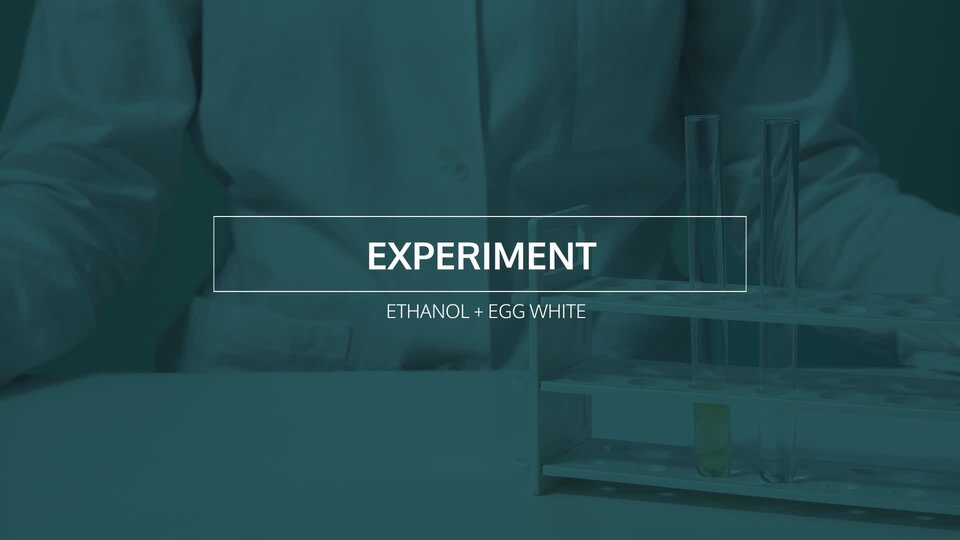 Eksperyment etanol plus białko jaja. Do wykonania eksperymentu wykorzystane są: etanol oraz białko jajka. Substancje znajdują się w dwóch probówkach. Laborant wkrapla pipetą kilka kropli etanolu pobranych z jednej probówki do probówki, w której znajduje się jajo. Na górze probówki wytrąca się biały osad i kożuch.