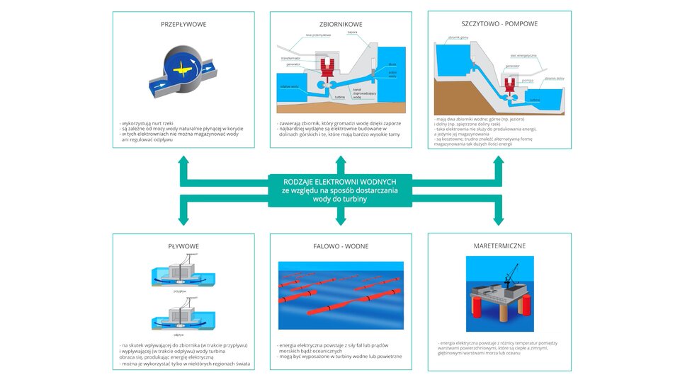 Na filmie ukazano i opisano różne rodzaje elektrowni wodnych, podzielone ze względu na sposób dostarczania wody do turbiny. Są to elektrownie: przepływowe, zbiornikowe, szczytowo—pompowe, maretermiczne, falowo—wodne oraz pływowe.