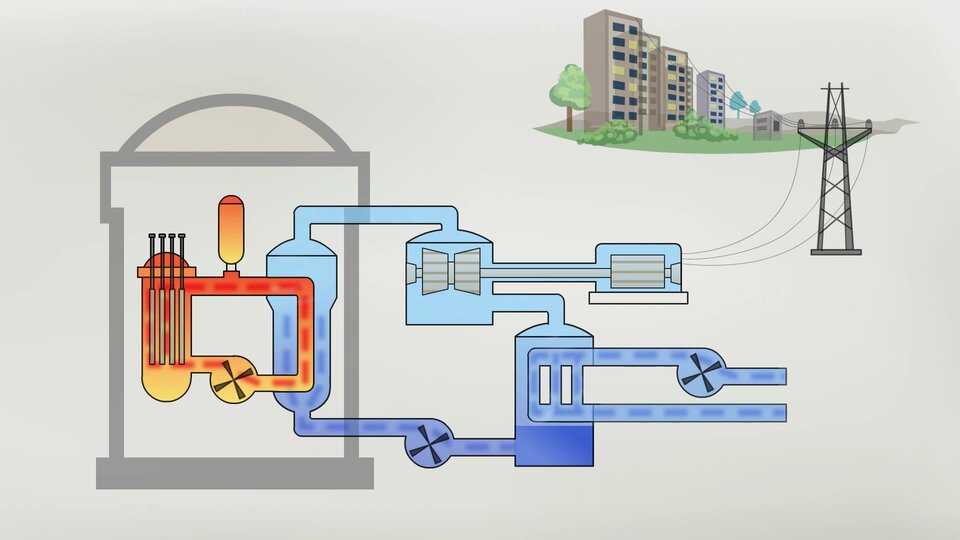 Na animacji przedstawiono schemat otrzymywania energii jądrowej w procesie rozszczepienia jąder ciężkich pierwiastków.