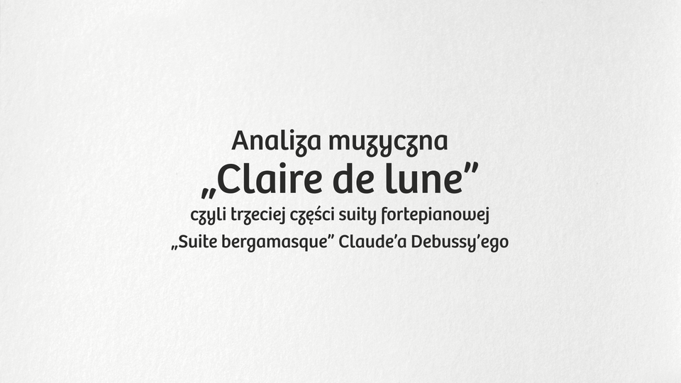 Materiał filmowy do lekcji zatytułowany „Analiza muzyczna Claire de lune ” [czytaj: kler de lun], czyli trzeciej części suity fortepianowej „Suite bergamasque” [czytaj: słite bergamaske] Claude'a Debussy'ego [czytaj: kloda debusiego].