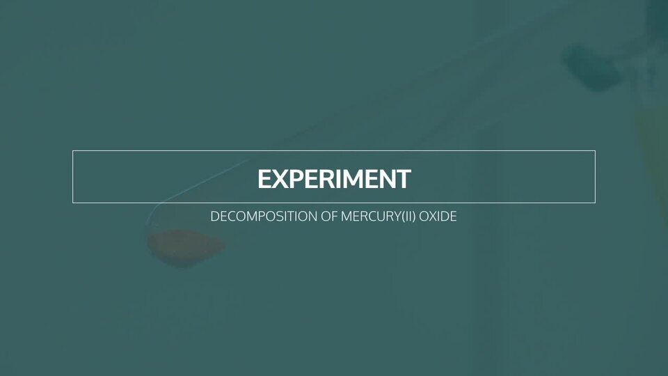 Film prezentujący rozkład tlenku rtęci (II). Na ekranie widoczny jest zestaw aparatury. Następuje zbliżenie na probówkę z tlenkiem rtęci(II). Wyraźnie widać jego czerwonopomarańczową barwę. Widok na zestaw w czasie pracy – płomień palnika ogrzewa probówkę z tlenkiem, w probówce wypełnionej wodą zbiera się gaz (tlen). Na ekranie pojawia się słowo: OBSERWACJE. Zbliżenie na probówkę z tlenkiem rtęci(II) – widać na ściankach probówki szaroczarny osad w postaci pierścienia. Sam osad tlenku też zrobił się czarny. Znika słowo: OBSERWACJE. Widok na pracujący zestaw, pod spodem pojawia się nazwa: reakcja chemiczna. Ponownie pojawia się słowo: OBSERWACJE. Widok na probówkę z gazem, zamkniętą korkiem, stojącą w statywie – ręka zbliża do niej żarzące się łuczywko, wyjmuje korek z probówki, wkłada je powoli do środka. Łuczywko rozpala się i pali się jasnym płomieniem nawet wewnątrz probówki. Na ekranie pojawia się słowo: WNIOSKI i przy probówce, w której prowadzono badanie palności pojawia się słowo: tlen. Widok na mieszaninę poreakcyjną z szarym pierścieniem osadu. Przy nim pojawia się słowo: rtęć. Na ekranie widać równanie reakcji.