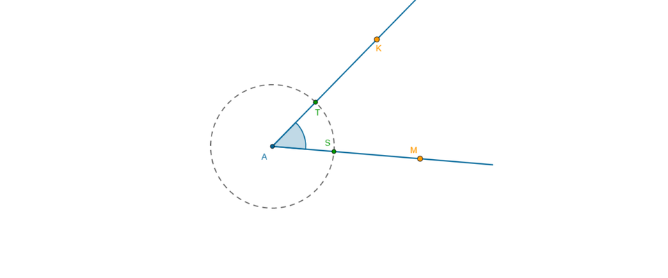 Na rysunku znajduje się kąt KAM oraz okrąg o środku w punkcie A, który przecina ramiona kąta w punktach S i T.