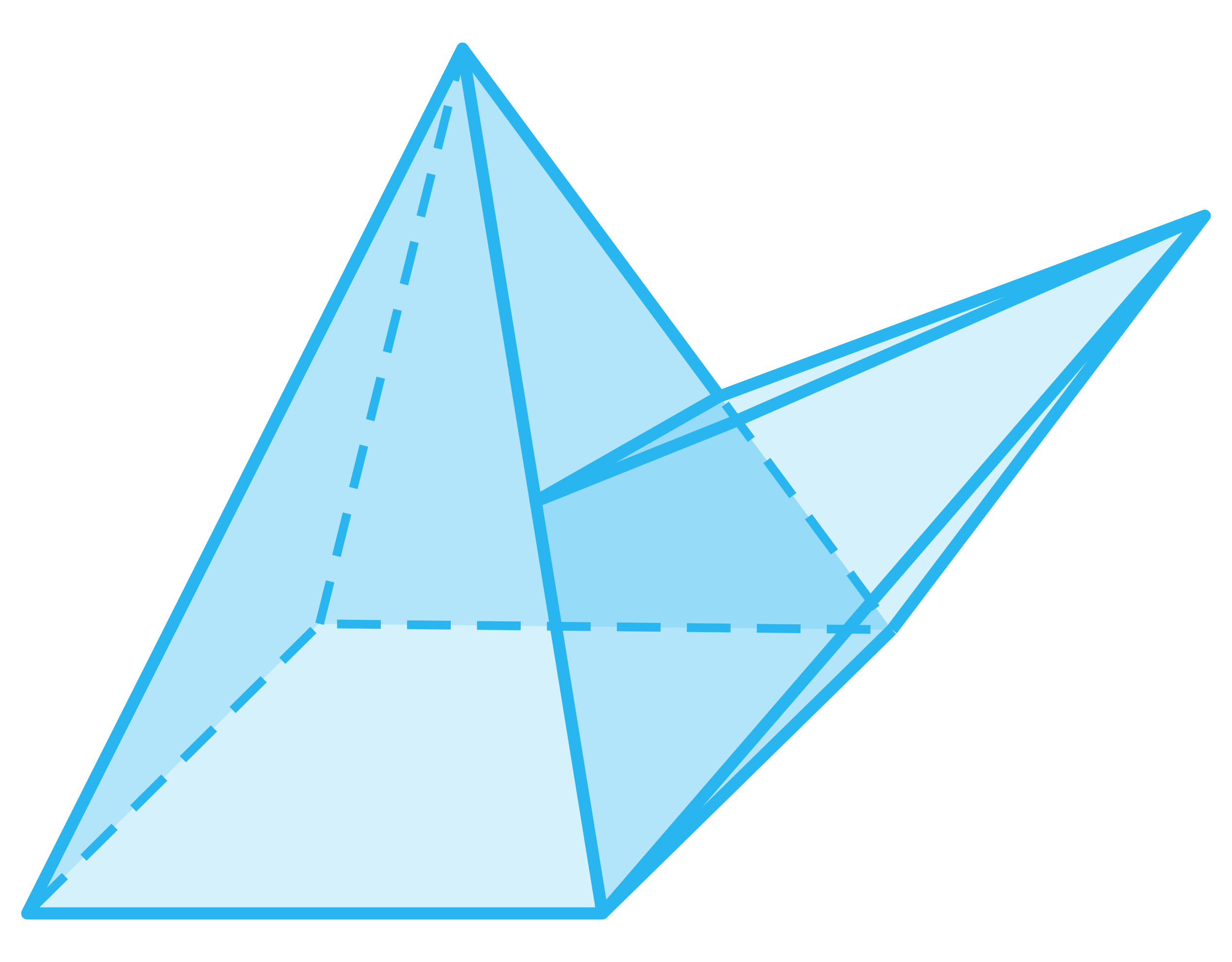 Animacja 3D. Przyjrzymy się teraz twierdzeniu Eulera dla jednospójnych wielościanów wypukłych. Czyli takich wielościanów, które nie są wydrążone tunelami, a ich ściany nie przenikają się, tak jak w wielościanach gwiaździstych. Wówczas między liczbą wierzchołków, krawędzi i ścian takich wielościanów zachodzi równość: . W to oczywiście liczba wierzchołków, K to liczba krawędzi, S to liczba ścian. W przypadku czworościanu mamy 4 wierzchołki, 6 krawędzi oraz 4 ściany, czyli . W przypadku prostopadłościanu lub każdego innego graniastosłupa czworokątnego mamy 8 wierzchołków, 12 krawędzi i 6 ścian, czyli . Rozpatrzmy teraz przypadki negatywne oraz pozytywne zbudowane za pomocą czworościanu. Zacznijmy od przypadków negatywnych. Jeżeli zetkniemy dwa czworościany w jednym wierzchołku, to wówczas mamy 7 wierzchołków, liczba ścian to 8, a liczba krawędzi wynosi dwanaście. Obliczmy teraz: , czyli równanie nie zachodzi. Sprawdźmy co się stanie, jeśli skleimy dwa czworościany wzdłuż krawędzi podstawy, tak że podstawy nie leżą w jednej płaszczyźnie. Liczba wierzchołków wynosi 6, liczba ścian jest równa 8, natomiast liczba krawędzi wynosi jedenaście. Policzmy teraz: . Przejdźmy do przypadków pozytywnych. Złączmy teraz czworościany wierzchołkami, ale na nieco większej powierzchni trójkątnej. Sprawdźmy teraz: mamy 9 wierzchołków, 8 ścian i 15 krawędzi, czyli . Sklejmy teraz czworościany identycznymi ścianami. Otrzymamy spójną bryłę, która ma 5 wierzchołków, 6 ścian i 9 krawędzi, czyli . Wróćmy na moment do wypukłości brył, w przykładzie z łączeniem czworościanów wierzchołkami, obie figury nie są wypukłe, w jednym przypadku nie wzór działa, a w drugim tak. Tajemnica jest związana z miejscem sklejenia, jeżeli to jest jeden pojedynczy punkt albo krawędź to wzór nie będzie działać, a jeśli mamy sklejenie na przykład trójkątne to przykład zadziała. Dla ułatwienia możemy wyobrazić sobie, że próbujemy napompować balonik w figurze tak, żeby dotykał on każdej ściany. W przykładach negatywnych nie jest to możliwe, natomiast w przedstawionych przykładach pozytywnych jest to możliwe. Uzasadnijmy teraz wzór Eulera. Załóżmy, że mamy czworościan. Widok od góry. Wierzchołek rozdziela trzy trójkątne ściany boczne. Widok od dołu, przyjmując, że podstawa jest półprzeźroczysta. Utożsamiamy zewnętrze tego trójkąta z podstawą, mamy wówczas podstawę, trzy trójkątne ściany boczne, wszystkie krawędzie i wszystkie wierzchołki. Uzyskaliśmy w ten sposób tak zwany diagram Schlegela, w tym przypadku reprezentujący czworościan. Każdy wielościan wypukły ma taki diagram. Wszystkie diagramy spełniają wzór Eulera, chociaż nie wszystkie diagramy Schlegela mają swoje wielościany. Idea dowodu jest indukcyjna. Dołóżmy na jednej z krawędzi jeden wierzchołek do diagramu Schlegela czworościanu. Wzrasta liczba wierzchołków, ale też wzrasta liczba krawędzi. Powstały diagram spełnia wzór Eulera, choć nie ma bryły, którą ten diagram reprezentuje. Możliwe jest stworzenie diagramu Schlegela sześcianu oddając odpowiednią ilość krawędzi i wierzchołków do diagramu Schlegela czworościanu, w każdym kroku równanie Eulera jest spełnione. Skoro jesteśmy w stanie stworzyć diagram Schlegela sześcianu, to jesteśmy w stanie stworzyć diagram dowolnego wielościanu wypukłego.