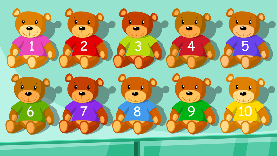 W animacji dziecko recytuje liczby od jeden do dziesięć po niemiecku, a na ekranie pojawiają się misie w koszulkach z odpowiednimi numerami.