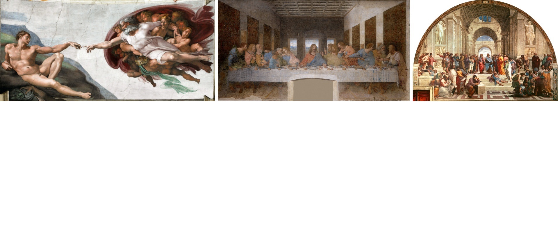 Rafael Santi- Szkoła Ateńska, Michał Anioł- Stworzenie Adama, Leonardo da Vinci- Ostatnia Wieczerza