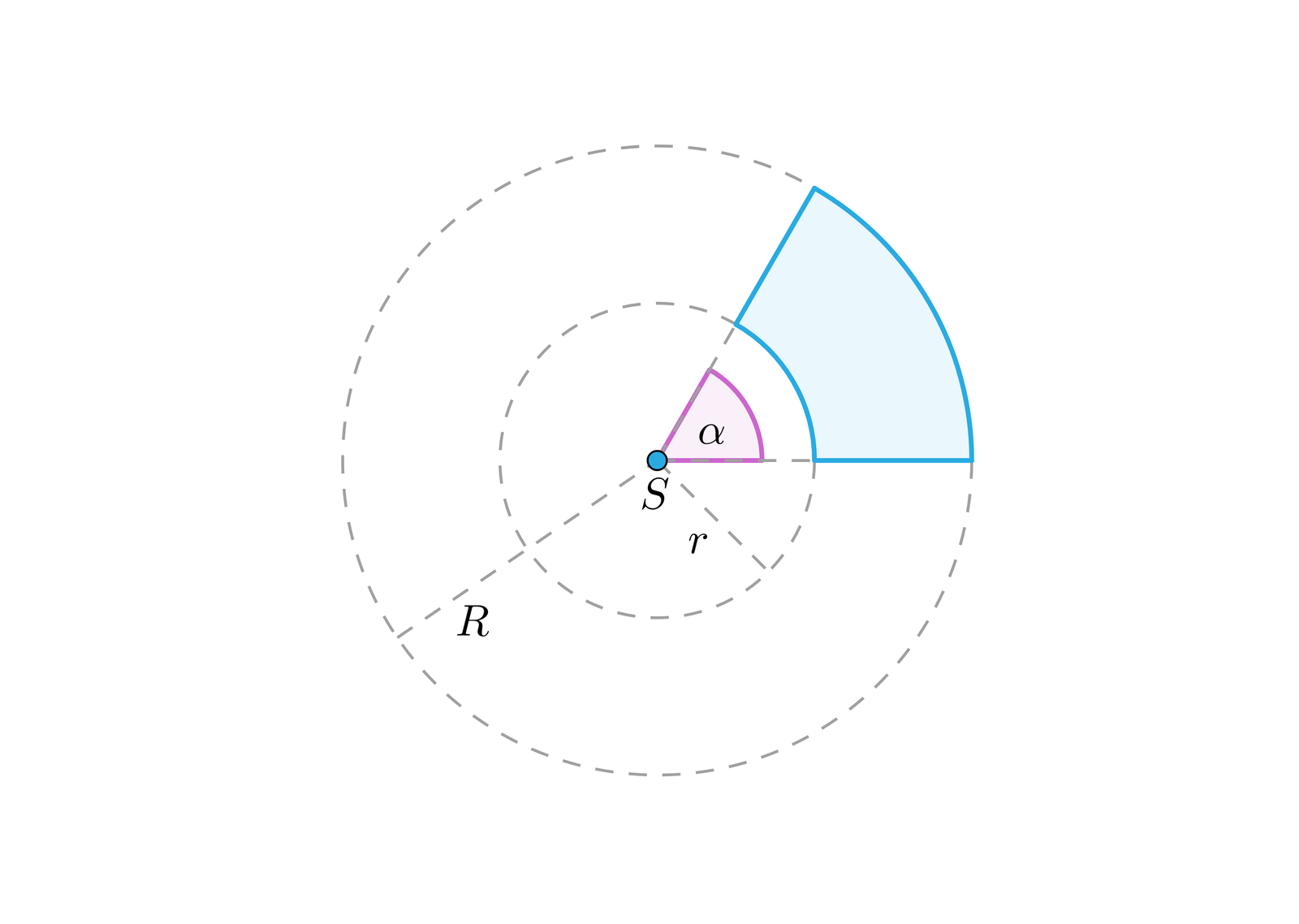 Zapoznaj się z apletem rysującym wycinek pierścienia kołowego o zadanych przez Ciebie parametrach i jednocześnie obliczającym jego pole powierzchni. Dodatkowo, ustawiając wartość wewnętrznego promienia na wartość , jesteś w stanie dokonywać pomiaru pola powierzchni wycinka kołowego o promieniu i wartości kąta środkowego .