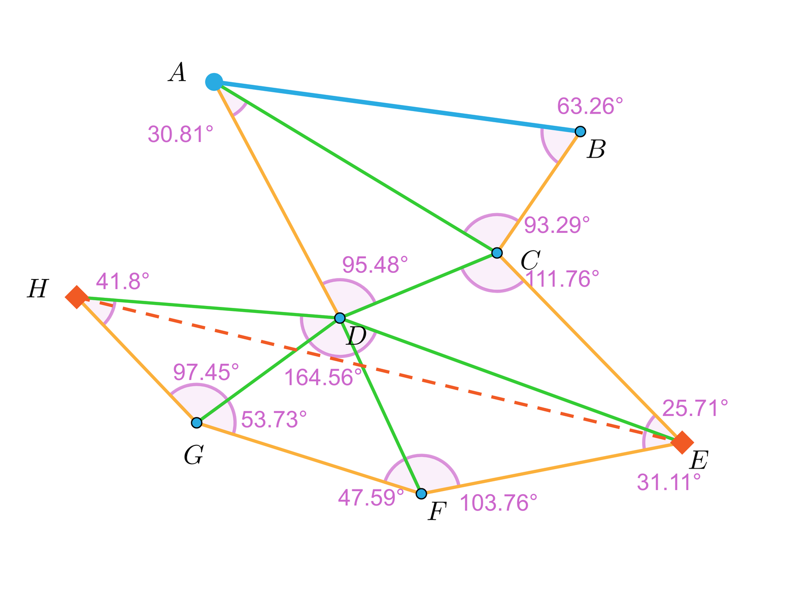 Aplet składa się z siedemnastu etapów. Miedzy etapami poruszamy się dzięki dwóm strzałką leżących na lewo i prawo od numeru etapu pod rysunkiem. W pierwszym etapie znajduje się zaznaczony punkt H oraz E. Punkty można przesuwać klikając w nie i przeciągając w dowolne miejsce na planszy apletu. Punkty połączone są ze sobą przerywaną linią świadczącą o tym, że szukamy długości odcinka HE. W drugim etapie na planszy pojawiają się punkty A,B,C,D,G i F. Są one rozrzucone po planszy przypadkowo, ale tak by utworzyć odpowiednią triangulację. Punkty dla rozważanego ustawienia punktów H i E układają się następująco. Punkty A, D, G znajdują się bliżej punktu H, a punkty B, C ,D bliżej punktu E. Punkt A leży na godzinie pierwszej, punkt D na godzinie czwartej, a punkt G na godzinie piątej od punktu H. Punkt F leży na godzinie ósmej, punkt C na godzinie dziesiątej, a punkt B na godzinie 11 od punktu E.W trzecim etapie dochodzi do utworzenia triangulacji między punktami. Powstaje sześć trójkątów. Wymienimy je po kolei: A B C, A C D, C DE, D E F, D F G oraz D G H. Korzystamy z założenia, że znamy długość odcinka AB, i miary wybranych kątów. W czwartym etapie pojawia się pod rysunkiem informacja, że . Na rysunku zaznaczają się kąty: oraz . Dzięki tym danym pod rysunkiem w etapie piątym pojawia się informacja, że . W szóstym etapie na rysunku pojawiają się nowe miary kątów: oraz . W siódmym etapie pojawia się długość odcinka DC równa . W kolejnym etapie na rysunku dochodzą kolejne miary kątów takich jak: oraz . W dziewiątym etapie w miejscu na komentarz pojawia się informacja, że . W dziesiątym etapie na rysunki pojawiają się nowe miary kątów, i . W jedenastym etapie dowiadujemy się, że . W dwunastym etapie na rysunku pojawiają się kolejne miary kątów, oraz .W trzynastym etapie w miejscu na komentarz pojawia się informacja, że . W czternastym etapie na rysunku pojawiają się miary kąta, oraz . W piętnastym etapie w miejscu na komentarz pojawia się długość odcinka DH równa . W etapie szesnastym na rysunku pojawia się miara kąta HDE i jest równa . W ostatnim etapie szukany odcinek ma długość . Zmieniając położenie punktu H i E w ostatnim etapie można zaobserwować, że im większy kąt H D E tym dłuższa długość boku H E.