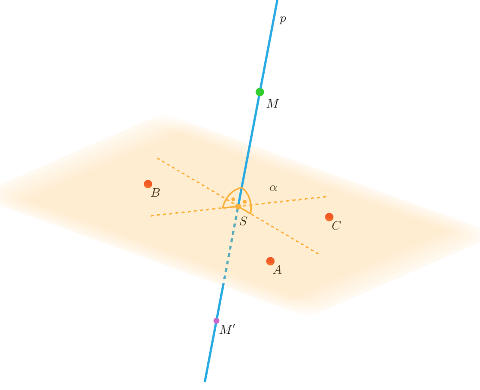 Aplet przedstawia płaszczyznę alfa przez która przechodzi prosta p. Na prostej zaznaczone są trzy punkty: M, S i M prim. Punkt S leży na płaszczyźnie alfa. Punkt M prim jest symetryczny do punktu M względem punktu S i znajduje się pod płaszczyzną. Punkty A B i C wyznaczają płaszczyznę alfa. Przykład 1. Niech , , oraz . Wówczas , . Przykład 2. Niech , , oraz . Wówczas i .