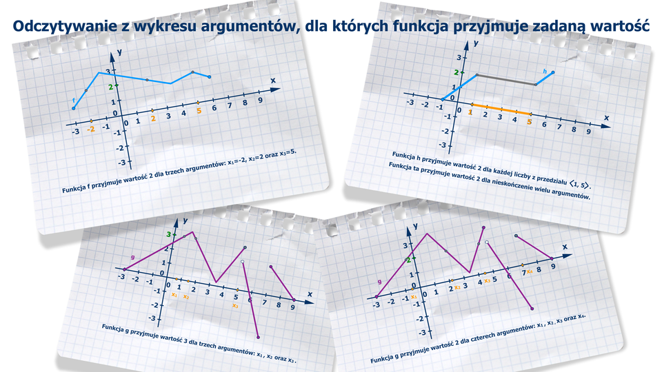 Aby odczytać z wykresu, czy i dla jakich argumentów funkcja przyjmuje wartość , wystarczy dorysować prostą równoległą do osi , na której leżą wszystkie punkty, których druga współrzędna jest równa (o takiej prostej mówimy, że ma równanie ). Jeżeli taka dorysowana prosta przecina wykres danej funkcji, to odczytując pierwszą współrzędną każdego z punktów przecięcia, wyznaczymy argumenty, dla których funkcja przyjmuje daną wartość.