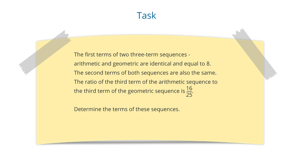 • You will learn how to calculate the terms of the arithmetic and geometric sequences with given relationships and dependencies between these terms.