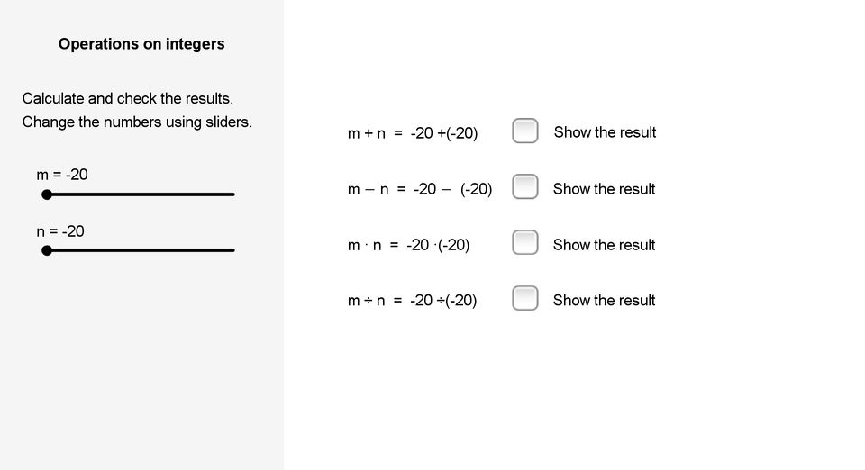 Na rysunku znajdują się cztery działania. m dodać n równa się cztery dodać w nawiasie zwykłym minus dziesięć, zamknąć nawias, zaznaczone okienko 'Show the result' równa się minus sześć. m odjąć n równa się cztery minus w nawiasie zwykłym minus dziesięć, zamknąć nawias, zaznaczone okienko „pokaż 'Show the result', równa się czternaście. m pomnożone przez n równa się cztery pomnożone przez w nawiasie zwykłym minus dziesięć, zamknąć nawias, zaznaczone okienko 'Show the result', równa się minus czterdzieści. m podzielone przez n równa się cztery podzielone przez w nawiasie zwykłym minus dziesięć, zamknąć nawias, zaznaczone okienko 'Show the result', równa się minus cztery dziesiętne.