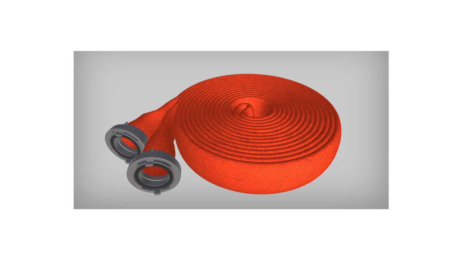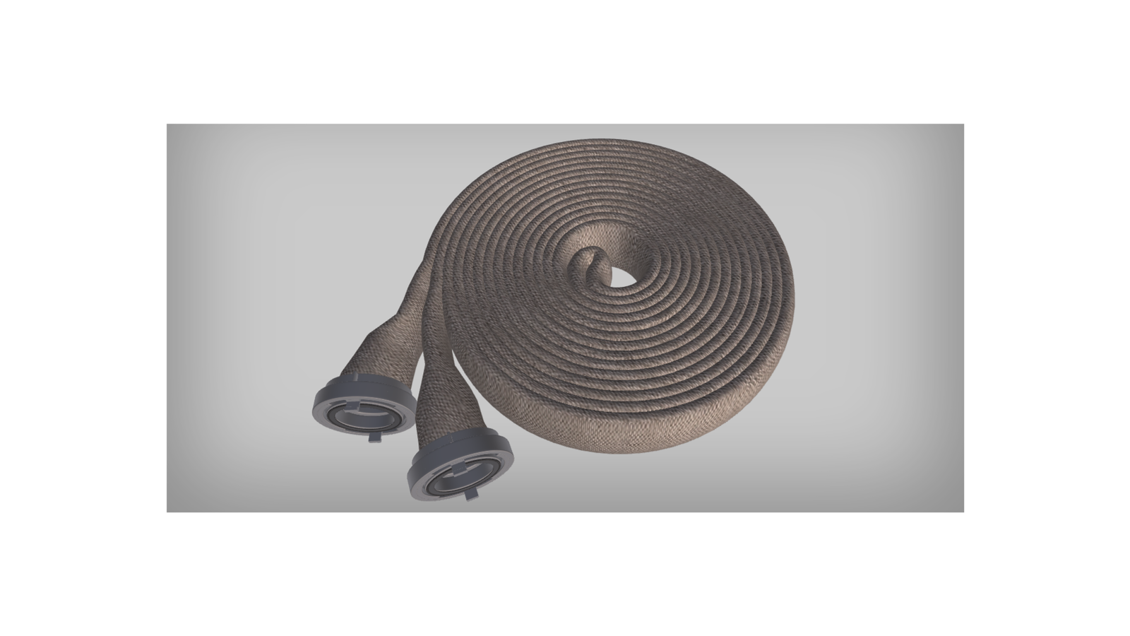 Wizualizacja przedstawia zwinięty wąż tłoczny o szarym kolorze. Wąż w stanie zwinięcia jest płaski. Zakończony jest po obu końcach okrągłymi, metalowymi łącznikami.