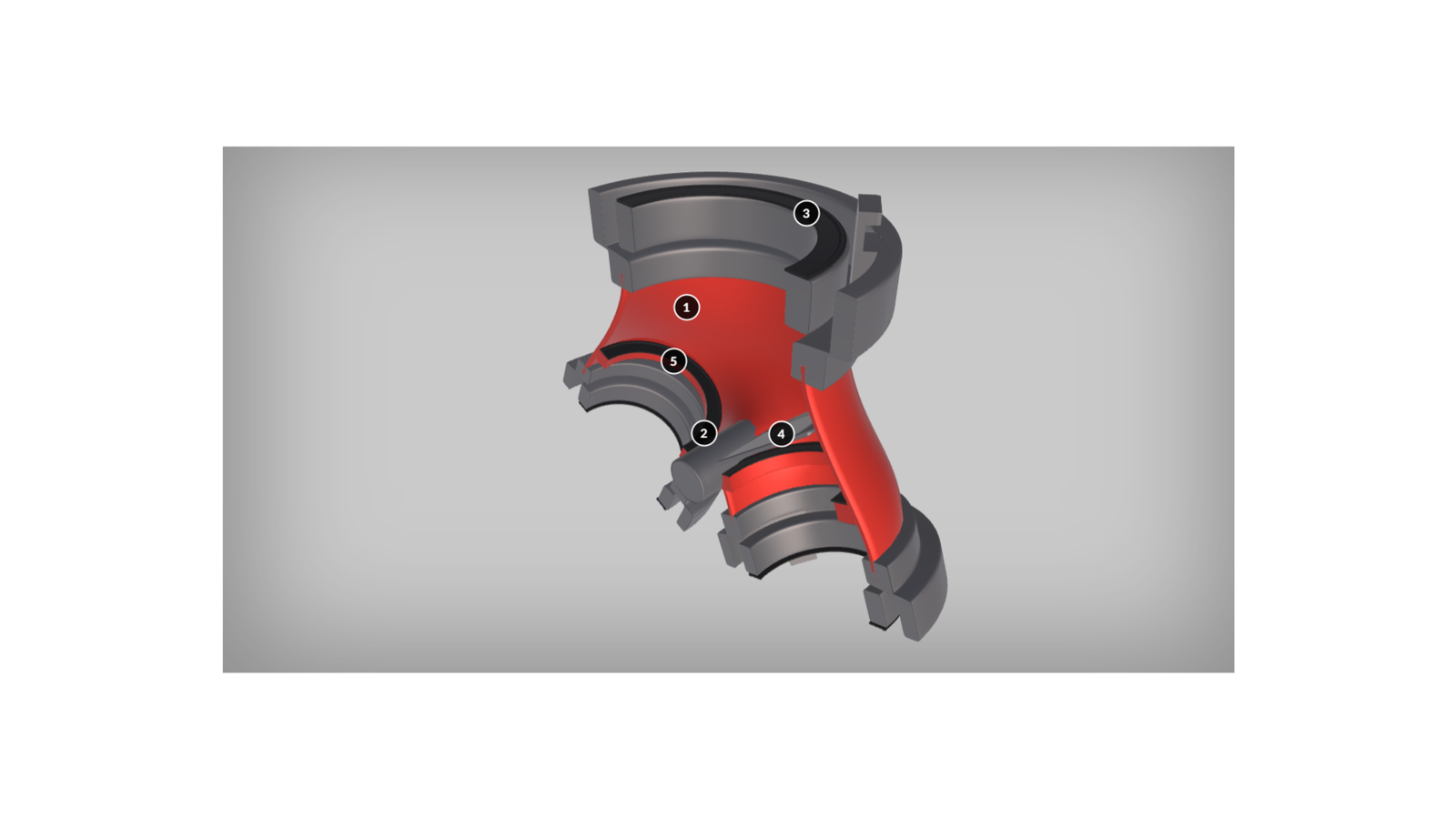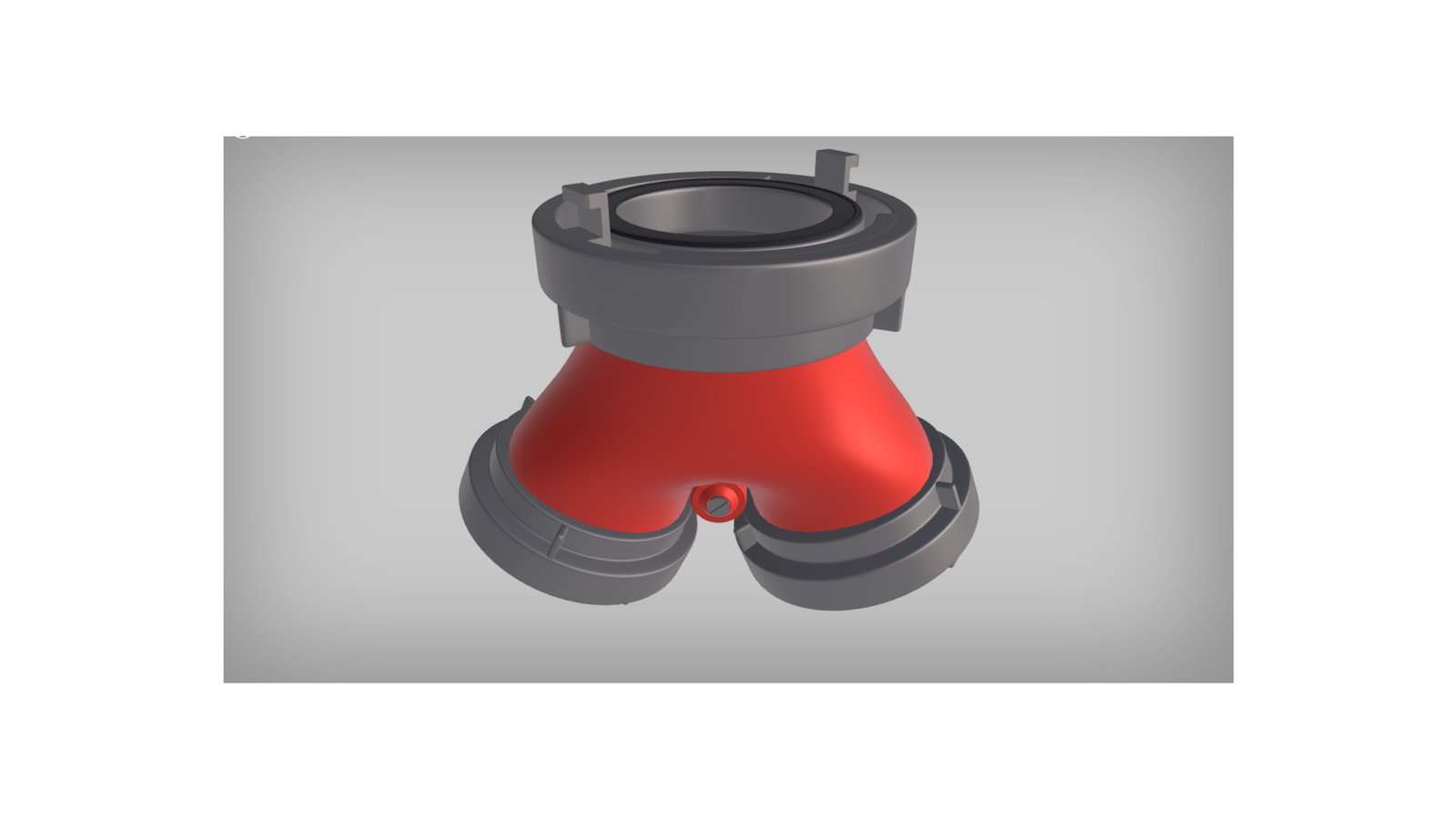 Wizualizacja przedstawia przekrój przez zbieracz. Składa się on z: korpusu, dwóch nasad wejściowych, nasady wyjściowej, swobodnie pracującej klapy oraz uszczelki klapy.