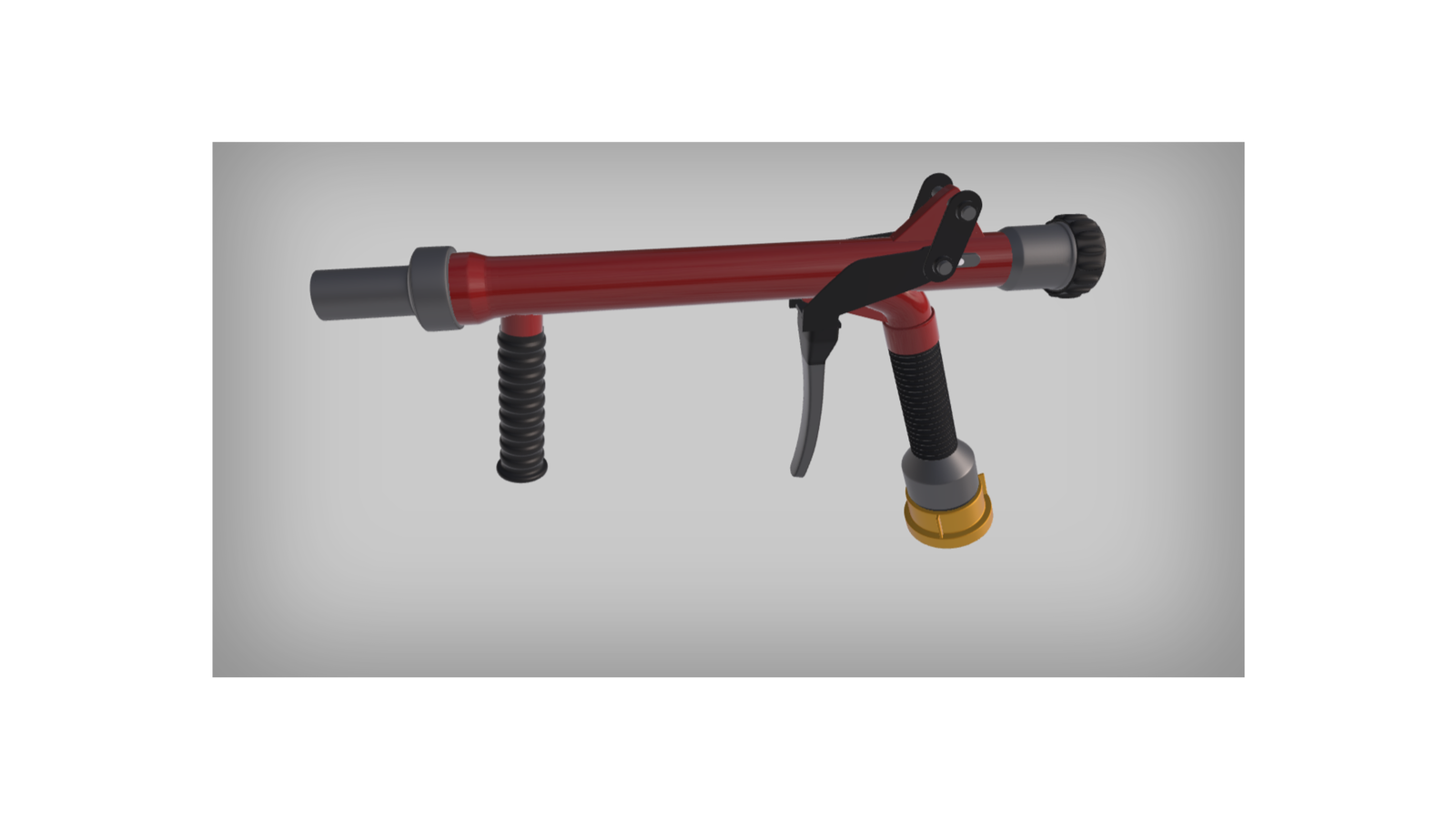 Wizualizacja przedstawia wytwornicę pianową. Składa się ona z: nasady, zaworu kulowego z dźwignią, manometru, płaszcza stalowego z rękojeścią oraz sitkiem wewnątrz. Wytwornica zakończona jest okładziną z tworzywa.
