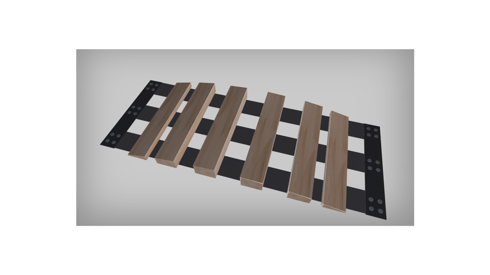 Wizualizacja przedstawia drewniany mostek przejazdowy. Składa się on z drewnianych belek, które połączone są ze sobą specjalną taśmą z jedwabiu polipropylenowego. Belki z taśmą połączone są za pomocą wkrętów. Belki na skrajach są płaskie, a belki w środku są grubsze.