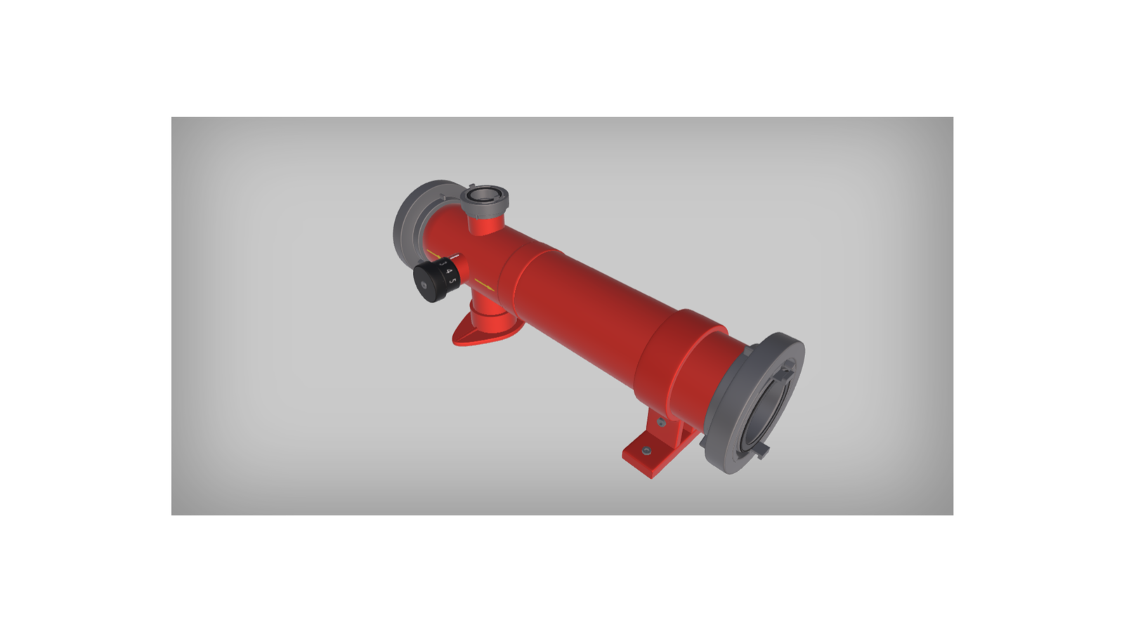 Wizualizacja przedstawia zasysacz liniowy. Ma on formę rury, która jest zakończona po obu stronach łącznikami. W podstawie korpusu znajdują się dwa wsporniki. Na bocznej ścianie korpusu znajduje się pokrętło oraz zaznaczony jest strzałkami kierunek przepływu.