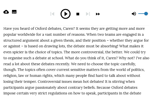 Based on the information from the audio, complete the sentences with the missing verbs. The first letters are given. 1. The best debates are the ones when participants     aTu uzupełnij     passionately about the topic. 2. Intense pace of the debate helps people     hTu uzupełnij     their speaking skills. 3. In order to gain an advantage over the opponents’ arguments, one needs to     pTu uzupełnij     forward strong rational points. 4. Debaters should     rTu uzupełnij     skillfully to opponents’ replies and questions. 5. Oxford debaters can     eTu uzupełnij     their analytical and research skills. 6. If you want to     iTu uzupełnij     your critical thinking skills, you should try taking part in debates. 7. While discussing the issue, one needs to     sTu uzupełnij     arguments objectively. It is essential to analyse them thoroughly and equally. 8. Minus points are given if a debater doesn’t     sTu uzupełnij     to the subject. No other matters, except the discussed one, can be analysed.