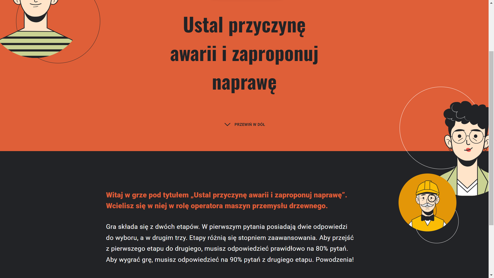 Gra edukacyjna – „Awarie, naprawy i konserwacje maszyn i urządzeń” wymaga trybu pełnoekranowego. Aby przejść do tego trybu, należy kliknąć przycisk: „Włącz tryb pełnoekranowy”.