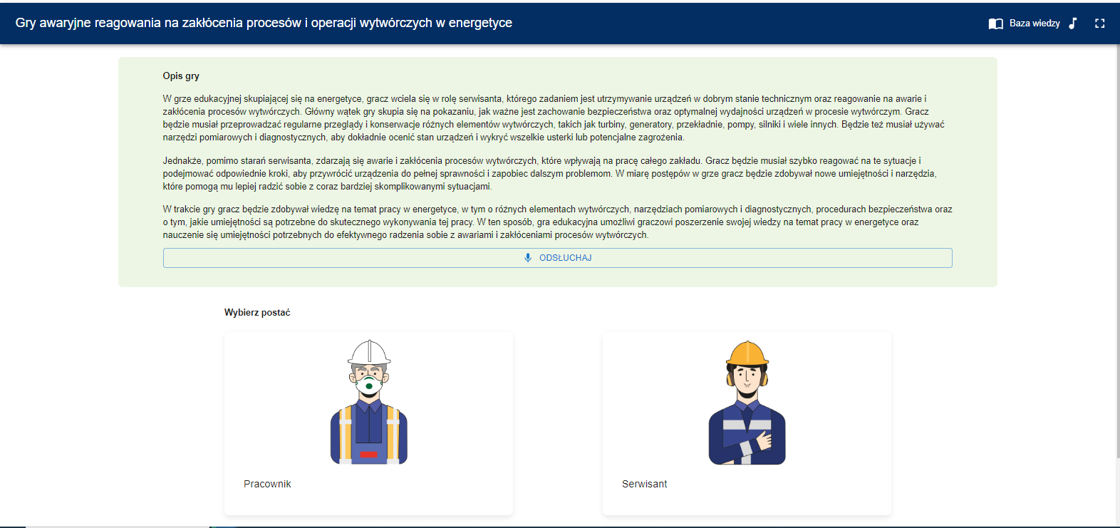 Postać, którą będziesz grać w tej edukacyjnej grze, to serwisant, którego praca polega na robieniu przeglądów elementów wytwórczych w energetyce. Twoim zadaniem będzie zapewnienie bezpiecznej i efektywnej pracy maszyn i urządzeń poprzez regularne kontrole i konserwację.