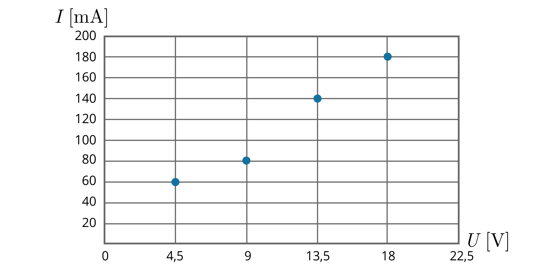 Na podstawie tabeli pomiarowej sporządź wykres ; na osi poziomej odłóż wartość napięcia elektrycznego , a na osi pionowej – wartość natężenia . Jakich jednostek użyjesz do oznaczenia osi poziomej, a jakich – do oznaczenia osi pionowej? Pamiętaj o tym, że każdy pomiar jest obarczony niepewnością, zatem nie można rysować linii łamanej od punktu do punktu.