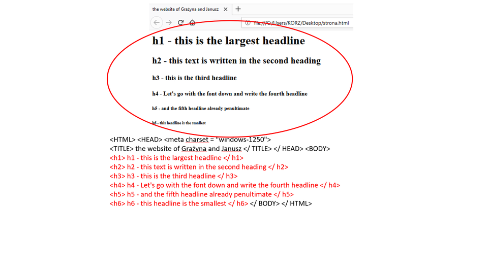 • <FONT color=”colour”> </FONT> - as colour we use English‑language names such as white, black, etc. But it is better to use the colour code in the hexadecimal notation (colour code tables you will find without problems on the Internet under the phrase „HTML colour codes”).