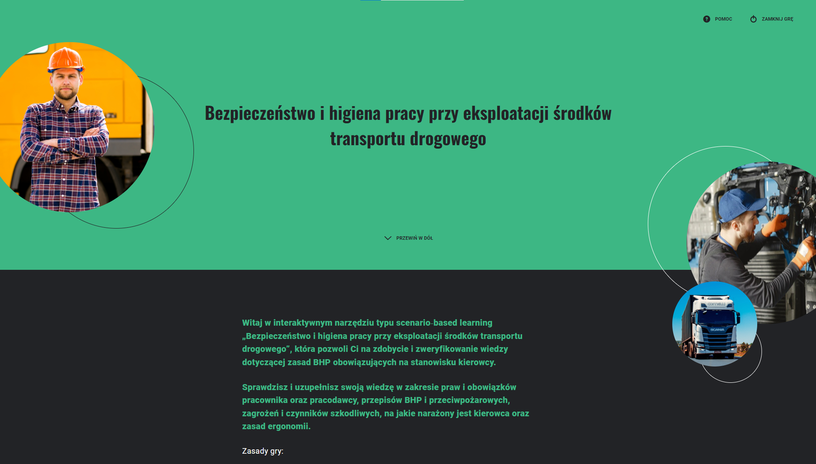 Interaktywne narzędzie typu scenario‑based learning pozwala sprawdzić wiedzę w temacie BHP przy eksploatacji środków transportu drogowego. Jego uruchomienie następuje po kliknięciu przycisku Włącz tryb pełnoekranowy.