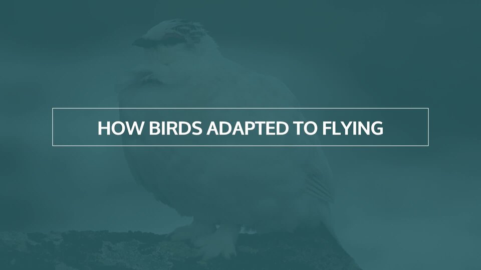 Nagranie filmowe dotyczące przystosowania ptaków do latania. Podpisano: Birds are homeothermic. They maintain stable body temperature of 39,5 degrees Celsius. Their feathers and the air between them keeps the body temperature from escaping. Birds learnt how to fly. (wskazano poszczególne części ciała ptaka) Their body is covered with feathers which create bearing surface. The keel in their chest and powerful chest muscles allow them to move their wings. How birds adapted to flying: A limb with 5 fingers transformed into a wing. Toothless jaws equipped with horny beak. Keel - the place where muscles responsible for wing movements are attached. It is the extension of the sternum. Their pelvis is not knit together in the front - it's adapted for laying eggs. Hind limb with elongated part of the foot works like a spring, throwing the bird into the air. Pneumatized bone filled with air (wskazano puste otwory w strukturze kości) podpisano: spaces filled with air. Oviparity. Birds embryo develops outside of mother's body and does not burden her during the flight. Keel is the place of support for the muscles that move the wings. Flight requires lots of energy. Lungs provide oxygen to the blood during inhales and exhales, thanks to air sacks. Wskazano i podpisano poszczególne części struktury ciała ptaka: humeral Diverticulum of the Clavicular Air Sac; Paranasal Sinus; Paratynpanic Sinus; Trachea; Cervical Air Sacs; Clavicular Air Sac; Anterior Thoracic Air Sacs; Posterior Toracic Air Sacs. Lung; Abdominal Air Sacs.
