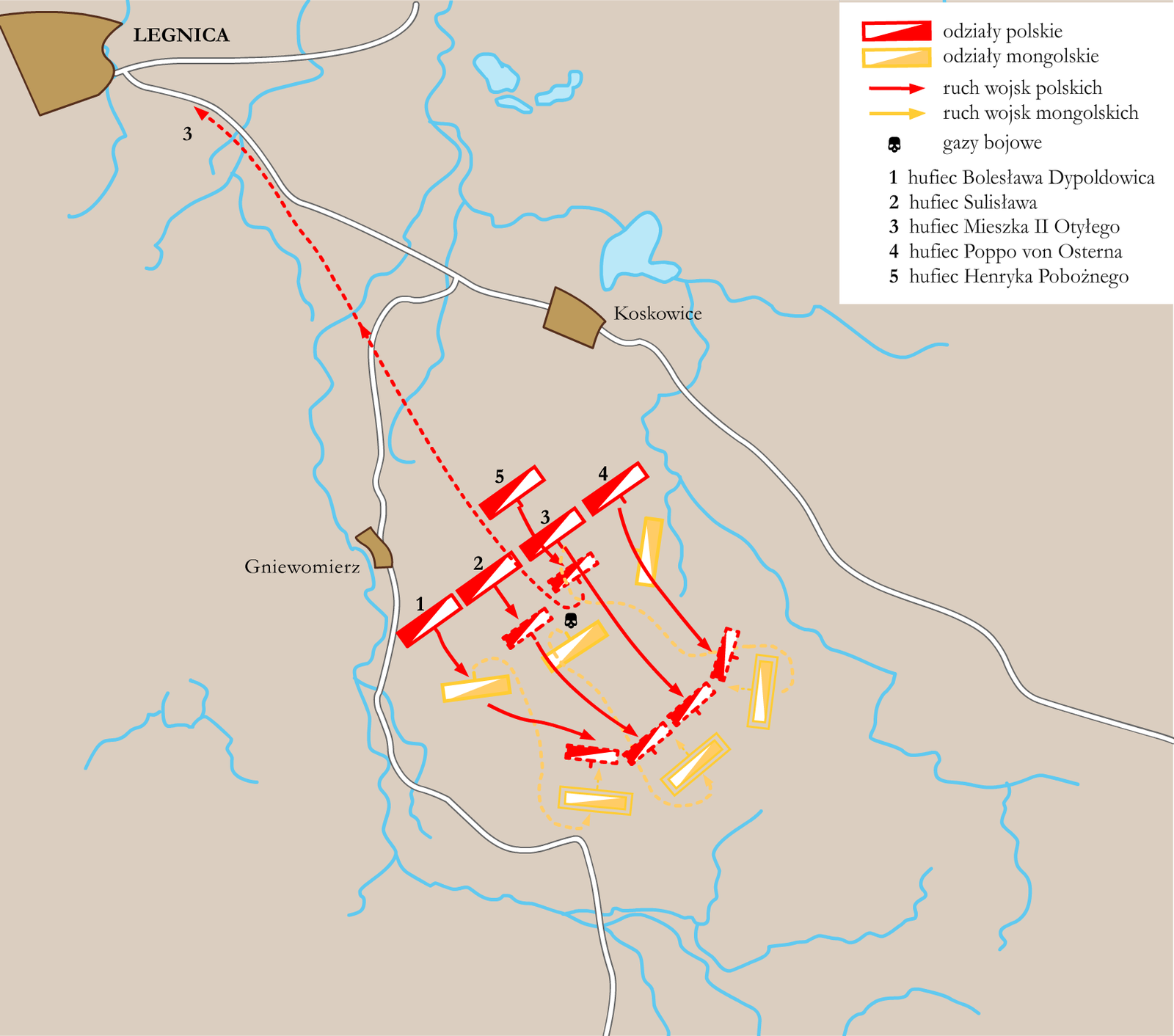 Mapa interaktywna pt. Bitwa pod Legnicą. Plan bitwy pod Legnicą w ułożeniu wyjściowym, w ułożeniu do ataku oraz w ułożeniu „pozorowanej ucieczki” i wypuszczenia gazów bojowych. Na planie pokazane jest też ułożenie rozstrzygające. Widoczne są pozycje wojsk i kierunki ich ruchu. Mapa składa się z warstwy bazowej i 3 warstw dodatkowych. Opis warstwy bazowej: Bitwa pod Legnicą 9 kwietnia 1241 roku Warstwy dodatkowe: ● Warstwa 1 - Faza wyjściowa bitwy. Faza wyjściowa bitwy Na warstwie 1 znajduje się 5 punktów z dodatkowymi informacjami: ► Punkt 1 - Oddział 1. Rycerstwo morawskie, joannici, templariusze, niemieccy górnicy ze Złotoryi i Lwówka pod wodzą margrabiego morawskiego Bolesława Dypoldowica, zwanego Szepiołką. Rozpoczynali w szyku liniowym. Z pozycji wyjściowej do ataku wzięli na siebie pierwszy impet wojsk mongolskich i zostali zasypani gradem strzał ich łuczników. ► Punkt 2 - Oddział 2. Rycerstwo krakowskie, sandomierskie, łęczyckie, sieradzkie pod wodzą Sulisława Dunina, brata poległego pod Chmielnikiem wojewody krakowskiego. Rozpoczynali w szyku liniowym. Z pozycji wyjściowej do ataku uderzyli jako formacja ciężkozbrojna przesuwając się najdalej ku pozycjom przeciwnika m.in. dzięki zastosowaniu kusz przeciw łucznikom mongolskim. ► Punkt 3 - Oddział 3. Rycerstwo górnośląskie i dolnośląskie księcia opolsko‑raciborskiego Mieszka II Otyłego. Rozpoczynali w szyku liniowym. Z pozycji wyjściowej do ataku uderzyli jako formacja ciężkozbrojna głównego kierunku natarcia. ► Punkt 4 - Oddział 4. Rycerstwo niemieckie, Krzyżacy pod dowództwem wielkiego mistrza Poppo von Osterna. Rozpoczynali w szyku liniowym. Z pozycji wyjściowej do ataku uderzyli z opóźnieniem, gdy operujące na prawym skrzydle oddziały mongolskie zaczęły napierać na śląskie rycerstwo. ► Punkt 5 - Oddział 5. Rycerstwo śląskie i wielkopolskie, pozostające w odwodzie, księcia wrocławskiego Henryka II Pobożnego. Weszli do działań w drugiej fazie bitwy, wspierając oddziały Mieszka II Otyłego na głównym kierunku natarcia. ● Warstwa 2 - Pozorowana ucieczka. Mapa przedstawia pozorowaną ucieczkę wojsk Na warstwie 2 znajdują się 3 punkty z dodatkowymi informacjami: ► Punkt 1 - Oddział 2. Rycerstwo krakowskie, sandomierskie, łęczyckie, sieradzkie pod wodzą Sulisława Dunina. Kontynuowali natarcie na oddziały mongolskie lewego skrzydła, które zaczęło się wycofywać. ► Punkt 2 - Oddział 3. Rycerstwo górnośląskie i dolnośląskie księcia opolsko‑raciborskiego Mieszka II Otyłego. Atak ich się załamał pod wpływem użycia gazów bojowych przez Mongołów oraz rzucenia dezinformacyjnego hasła do odwrotu. W konsekwencji niespodziewanie hufiec wycofał się z walki i podążył do Legnicy, zmuszając wojska odwodowe Henryka II Pobożnego do wejścia w miejsce nacierających oddziałów i pozostawienie niezabezpieczonych tyłów. Zaistniałą sytuację Henryk II Pobożny ocenił stwierdzeniem: „Gorze nam się stało”. ► Punkt 3 - Symbol trupiej główki. Była tam w ich (mongolskim) wojsku między innymi chorągwiami jedna ogromnej wielkości. […] na wierzchołku jej drzewca tkwiła postać głowy wielce szpetnej i potwornej z brodą, kiedy więc (Mongołowie) w tył się byli cofnęli i zabierali do ucieczki, chorąży niosący ów proporzec począł tą głową z całej siły machać, a natychmiast buchnęła z niej jakaś para gęsta, dym i wiew tak smrodliwy, że za rozejściem się między wojskami tej zabójczej woni Polacy mdlejący i ledwo żywi ustali na siłach i niezdolnymi się stali do walki. Źródło: Jana Długosza Roczniki czyli Kroniki sławnego Królestwa Polskiego, ks. 7, Warszawa 2009, s. 24 ● Warstwa 3 - rozstrzygnięcie bitwy. Warstwa dodatkowa 3 Na warstwie 3 znajdują się 4 punkty z dodatkowymi informacjami: ► Punkt 1 - Oddział 1. Rycerstwo morawskie, joannici, templariusze, niemieccy górnicy ze Złotoryi i Lwówka pod wodzą margrabiego morawskiego Bolesława Dypoldowica, zwanego Szepiołką. Z uwagi na słabe opancerzenie, zwłaszcza niemieckich górników, oraz przerzedzenie szeregów zniszczonych atakiem mongolskich łuczników nie byli w stanie utrzymać pozycji i w walce wręcz, oblegani ze wszystkich stron, ponieśli klęskę, a nieliczni rozpierzchli się w ucieczce. Bolesław Dypoldowic zginął. Jego szczątki pochowano w klasztorze cystersów w Lubiążu. ► Punkt 2 - Oddział 2. Rycerstwo krakowskie, sandomierskie, łęczyckie, sieradzkie pod wodzą Sulisława Dunina. Wobec odstąpienia z pola walki hufca Mieszka II Otyłego pozostawał nieosłonięty z prawego skrzydła, co doprowadziło do wejścia w to miejsce odwodu mongolskiego wodza Bajdara. Impet natarcia się załamał i doszło do walki wręcz skutkującej ogromnymi stratami. ► Punkt 3 - Oddział 4. Rycerstwo niemieckie, Krzyżacy pod dowództwem wielkiego mistrza Poppo von Osterna. Operowali na prawym skrzydle wojsk mongolskich i długi czas utrzymywali pozycję pomimo niezabezpieczonej lewej flanki. W momencie wejścia wojsk odwodowych Bajdara załamało się ich natarcie, które nie potrafiło zniwelować spieszące im na pomoc rycerstwo odwodowe księcia Henryka II Pobożnego. Okrążeni ponieśli klęskę, a nieliczni umknęli z pola walki. ► Punkt 4 - Oddział 5. Rycerstwo śląskie i wielkopolskie, pozostające w odwodzie, księcia wrocławskiego Henryka Pobożnego. Wspierali hufiec Sulisława Dunina celem utrzymania natarcia i przełamania linii okrążenia jego wojsk. Wobec przewagi przeciwnika w obliczu ogromnych strat własnych ponieśli klęskę, a tylko nieliczni ulegli rozproszeniu. Osłaniany m.in. przez Sulisława Dunina książę Henryk II Pobożny został raniony i pojmany przez Mongołów. Najprawdopodobniej został zmuszony do uklęknięcia przed zwłokami wodza mongolskiego poległego pod Sandomierzem, a następnie ścięty. Jego ciało pozostało na pobojowisku, gdzie zostało