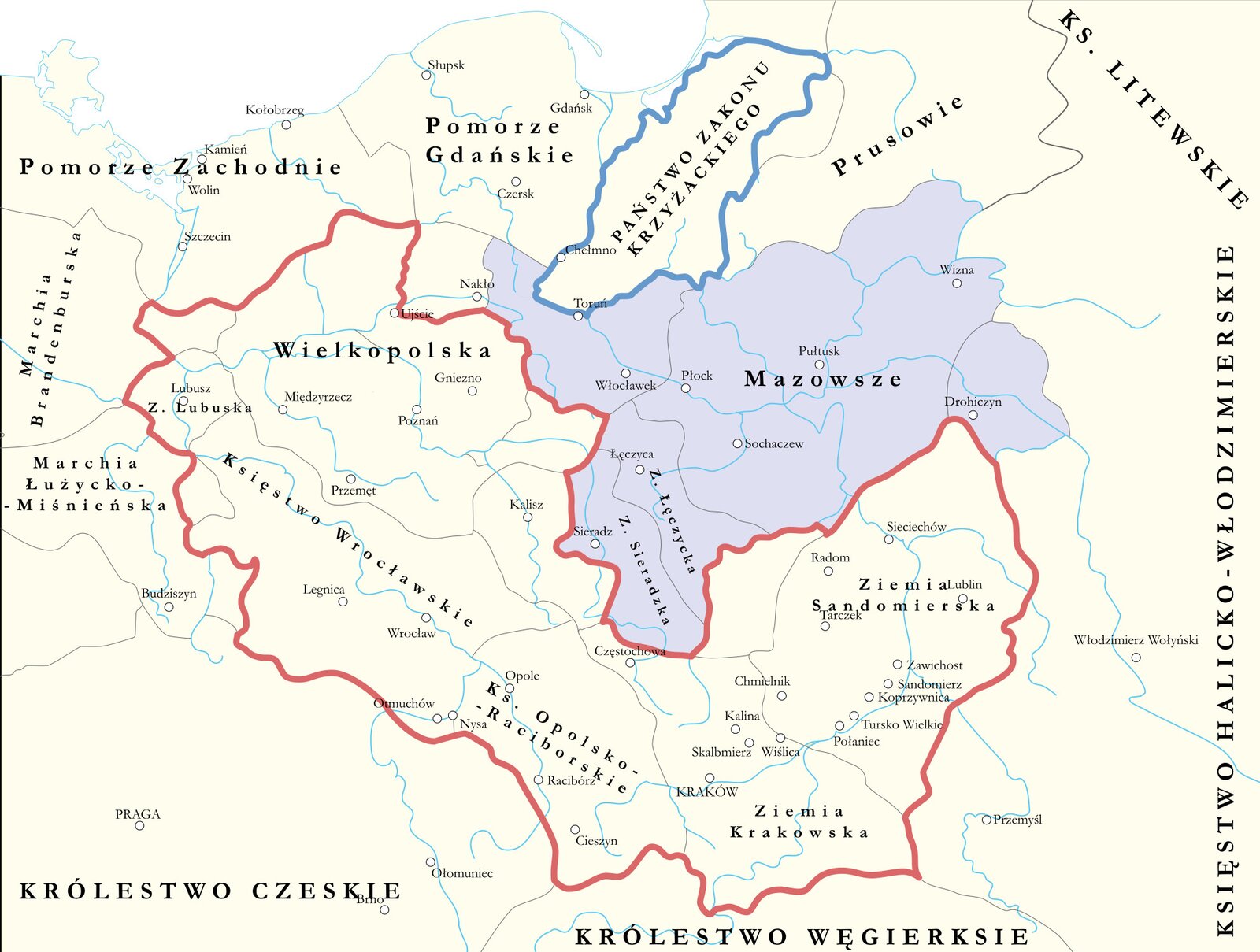Mapa interaktywna pt. Najazd mongolski na ziemie polskie w 1241 roku. Mapa ziem polskich w momencie najazdu mongolskiego. Mapa przedstawia poszczególne dzielnice Polski, granice monarchii Henryków śląskich oraz granice państwa Konrada Mazowieckiego. Pokazuje też sąsiadów Polski, w tym zakon krzyżacki. Zaznaczone są główne miasta: Włodzimierz Wołyński, Przemyśl, Lublin, Sieciechów, Zawichost, Sandomierz, Koprzywnica, Tarczek, Chmielnik, Tursko Wielkie, Połaniec, Wiślica, Kalina, Kraków, Skalbmierz, Racibórz, Ołomuniec, Otmuchów, Opole, Wrocław, Legnica, Łęczyca, Sieradz, Kalisz, Płock, Włocławek, Gniezno, Poznań. Mapa składa się z warstwy bazowej i 3 warstw dodatkowych. Opis warstwy bazowej: Mapa przedstawia granice monarchii Henryków Śląskich, granice państwa Konrada Mazowieckiego oraz główne miasta polskie. Na warstwie bazowej znajduje się 22 punktów z dodatkowymi informacjami: ► Punkt 1 - Tursko Wielkie. Miejsce bitwy stoczonej 13 lutego 1241 roku przez rycerzy polskich pod dowództwem wojewody krakowskiego Włodzimierza Dunina z żołnierzami mongolskimi przez Bajdara. Do starcia doszło po wycofaniu się w rejonie Miechowa idących na Kraków żołnierzy mongolskich. Odwrót wojsk Bajdara w kierunku Sandomierza został zatrzymany przez małopolskie rycerstwo w rejonie Turska, gdzie rozegrała się bitwa. Mongołowie zastosowali odwrót taktyczny i rozerwali polski szyk bojowy. Chaos w oddziałach ciężkozbrojnej jazdy doprowadził od dużych strat w polskich szeregach i przyczynił się do przegranej. Zwycięskie oddziały mongolskie wycofały się wzdłuż lewego brzegu Wisły do Sandomierza. ► Punkt 2 - Chmielnik. Miejsce bitwy stoczonej 18 marca 1241 roku przy trasie na Szydłów w miejscu zwanym Wesołe Pole przez główne siły mongolskie pod dowództwem Bajdara z idącymi im naprzeciw od strony Gór Świętokrzyskich rycerzami krakowskimi i sandomierskimi pod dowództwem wojewody krakowskiego Włodzimierza Dunina, wojewody sandomierskiego Pakosława oraz kasztelanów: krakowskiego Klemensa z Brzeźnicy oraz sandomierskiego Jakuba Raciborowica. Ciężar bitwy wzięło na siebie lewe skrzydło wojsk polskich, złożone z rycerstwa małopolskiego. Przez kilka godzin odpierało ataki Mongołów, którzy następnie zastosowali „pozorowaną ucieczkę”, wprowadzając rozprężenie w polskich szeregach. Na zdezorientowanych Polaków uderzył oddział odwodowy, który doprowadził do rozerwania szyku wojsk polskich na dwie grupy. Pierwsza z ogromnymi stratami rozpierzchła się, druga wycofała się w kierunku północnym, aby następnego dnia stoczyć bitwę pod Tarczkiem. Ulokowane na prawym skrzydle rycerstwo sandomierskie, widząc rzekomy odwrót Mongołów, podążyło do Krakowa. Podczas bitwy polegli obaj kasztelani oraz wojewoda krakowski Włodzimierz Dunin. ► Punkt 3 - Tarczek. Miejsce bitwy stoczonej 19 marca 1241 roku między operującymi na kierunku północnym w stronę Ziemi Łęczyckiej i Kujaw oddziałami mongolskimi pod dowództwem Kajdana a uchodzącym spod Chmielnika rycerstwem małopolskim. Mongołowie przegrupowujący się w rejonie Bodzentyna natknęli się na rozbite oddziały polskiej jazdy i w krwawej walce je pokonały. Wraz z tą klęską małopolskiego rycerstwa otwarta została droga na Kraków, do którego armia Kajdana wkroczyła 1 kwietnia. Tu połączyła się z głównymi siłami i wspólnie 7 kwietnia dotarła do Wrocławia. ► Punkt 4 - Racibórz. Miejsce bitwy stoczonej 20 marca 1241 roku między siłami polskimi pod dowództwem księcia opolsko‑raciborskiego Mieszka II Otyłego a oddziałami zwiadowczymi wojsk mongolskich. Mongołowie przeprawiający się wpław z powodu zniszczonych mostów na lewy brzeg Odry zostali tam zaatakowani przez miejscowe rycerstwo i pokonani. W walce zginęło około 400 Mongołów. Wojska Mieszka II Otyłego, pozostawiając wzmocnioną załogę grodu, pociągnęły do Legnicy, gdzie książę wrocławski Henryk II Pobożny gromadził główne siły. ► Punkt 5 - Opole. Miejsce bitwy stoczonej 5 kwietnia 1241 roku między rycerstwem polskim pod dowództwem księcia opolsko‑raciborskiego Władysława a nadciągającymi od Krakowa i Raciborza siłami mongolskimi pod wodzą Bajdara. Idące wzdłuż Odry na Wrocław i Legnicę siły mongolskie napotkały oddziały polskie z Małopolski i Opolszczyzny, które wobec przewagi nieprzyjaciela po krótkiej walce wycofały się do Wrocławia. Mongołowie nie podejmowali się oblężenia miasta, ale w obawie, że książę wrocławski Henryk II Pobożny połączy swoje siły z królem czeskim Wacławem I, spiesznie przemieszczali się w stronę Legnicy. ► Punkt 6 - Legnica. Miejsce bitwy stoczonej 9 kwietnia 1241 roku na południowy wschód od miasta w miejscu zwanym Dobre Pole między rycerstwem polskim ze Śląska, Małopolski i Wielkopolski oraz posiłkami cudzoziemskimi, głównie z Niemiec i Czech, a wojskami mongolskimi. Zakończyła się ona klęską, a głównodowodzący siłami polskimi książę wrocławski Henryk II Pobożny poległ. Jego ściętą głowę wbitą na pal Mongołowie pokazali obrońcom Legnicy, ale grodu nie zamierzali oblegać. Po wycofaniu się w rejon Otmuchowa armia mongolska się podzieliła. Część z rannymi i zwłokami wodza zabitego pod Sandomierzem powróciła na Ruś. Pozostała większość udała się na Węgry przez Morawy, pustosząc je po drodze, aby połączyć się z głównymi siłami Batu‑chana. ► Punkt 7 - Włodzimierz Wołyński. Warowny gród ruski nad rzeką Ług na Wołyniu w pobliżu dawnej granicy Grodów Czerwieńskich, zniszczony z wyjątkiem soboru Zaśnięcia Matki Bożej podczas najazdu mongolskiego w grudniu 1240 roku. Po wymordowaniu ludności Mongołowie założyli tam obóz, aby przezimować i przygotować się do inwazji na ziemie polskie. Zgromadzili około 20 tysięcy żołnierzy pod dowództwem Ordy, najstarszego wnuka Czyngis‑chana. Atakiem na ziemie p