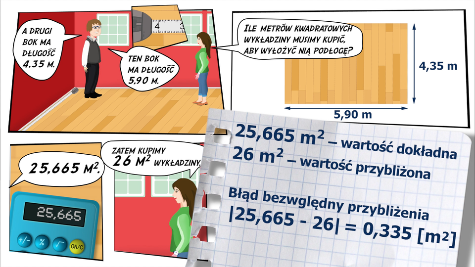 Należy pomalować lakierem podłogę w prostokątnym pokoju o wymiarach i . Powierzchnia podłogi jest równa . W celu oszacowania, ile lakieru należy kupić, możemy przyjąć, że powierzchnia podłogi jest równa . Pomylimy się wtedy o .