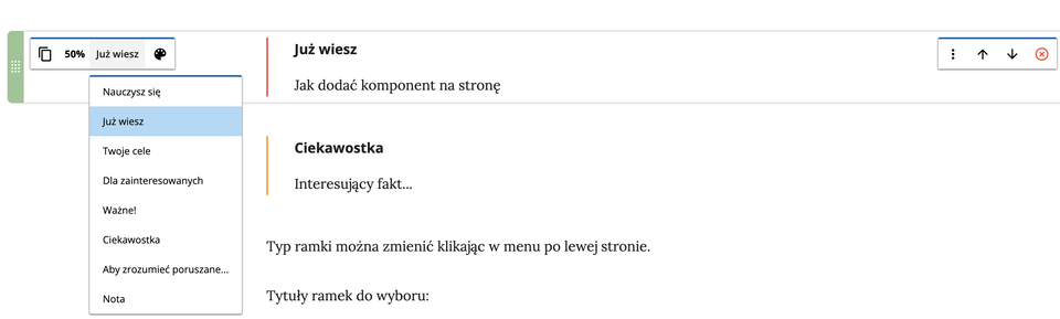 Blok lekcyjny to ramka do wstawienia treści pomocniczej w materiale. Może być wykorzystana do łączenia komponentów w grupy np. tekstu i zdjęć lub ćwiczeń (poprzez przeciągniecie elementów do tego komponentu).