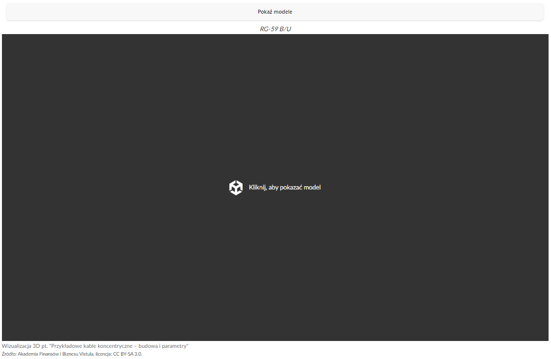 Na modelu umieszczony jest znacznik z cyfrą jeden. Po kliknięciu w punktor pojawia się pole boczne, a na nim pasek odtwarzania z treścią tożsamą z tą poniżej: Przewód koncentryczny Pe Ce Ce sto trzynaście służy do instalacji zbiorczych długich odcinków instalacji, gdzie niezbędne jest niskie tłumienie. Wykorzystywany jest też w domowych instalacjach antenowych.